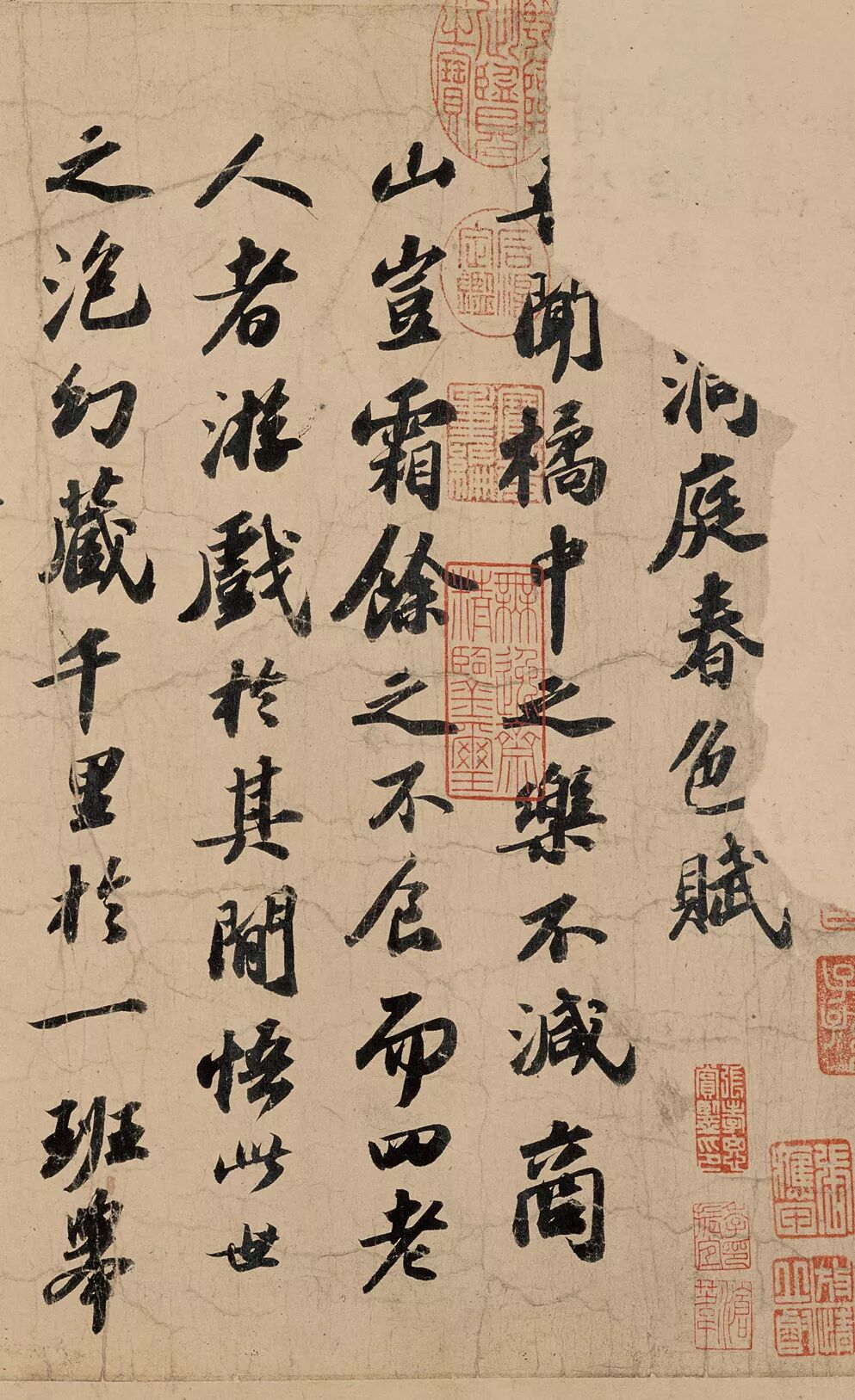 右将军金紫光禄大夫王羲之书八十一字赞,昭回于天垂英光,跨颉历籀化大荒。烟华澹浓动彷徉,一噫万古称天章。鸾夸虬举鹄序行,洞天九九通寥阳。茫茫十二小劫长,玺完神诃命芾藏。癸未岁太常玉堂手装。左司郎中黄诰。隋珠荆玉烂生光,际天蟠地射八荒。嗟我一见犹激昂,而况好古真元章。不买金钗十二行,以彼易此归华阳。天公六丁气焰长,雷电取去宜深藏。职方郎中刘泾。至人代天发幽光,手生苍华秀芜荒。万夫蛇蚓谢轩昂,断是龙被五色章。大珠自点玉著行,印跋翕受交混茫。公其敬识神理长,不畀正眼非归藏。承议郎薛绍彭。宝晋不空来夜光,沧浪一濯聊治荒。至宝无价谁低昂,怀充押尾开元章。楷字不见褚影行,永和岁月今茫茫。传至太平随世长,金题玉躞重珍藏。刘泾。金十五万一色光,平生好奇非破荒。神明顿还貌昂昂,冠佩肃给系宝章。晓趋大庭动鹓行,但笑不与见者忙。北窗卷舒化日长,何必绝人洗而藏。绍彭。晋大司马至洛阳,威略已著摧破羌。声驰江左传国光,右军笔阵争堂堂。妙用作意驱俊铓,惊鸿乍起游龙翔。仁祖无奕乌衣郎,挂名篇末流遗芳。开元散落王涯藏,联翩飞动茂密行。料简鉴赏盛有唐,传授视此真印章。