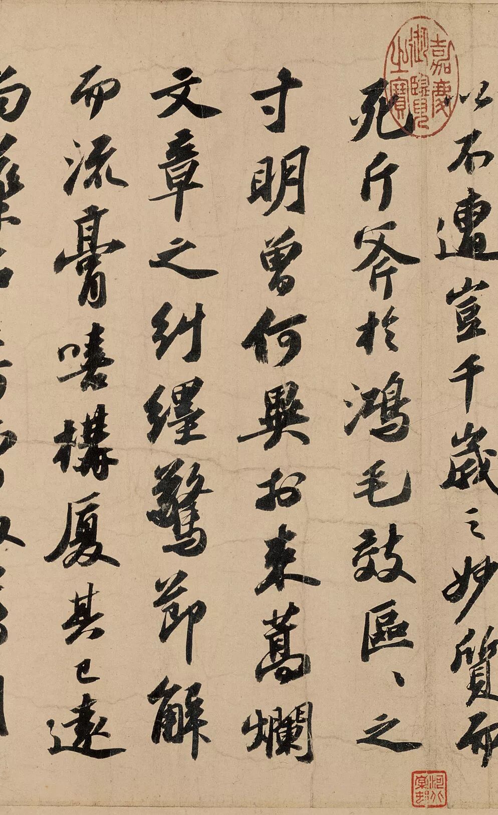 有宋书学以苏黄米蔡号称四家,后世对于“蔡”为何人,尚有襄、京两种观点未能统一。愚以为,蔡京名列大奸,书迹耻为世藏,今日所能寓目已如星凤,若就仅见者与蔡襄相比,或许相形见绌。然而对于一种时代风气的蔚然形成,君谟是否起到导夫先路的作用,似乎还很难肯定。宋代“尚意”书风的勃然飙举,是在神、哲、徽宗三朝,而苏轼(一〇三七——一一〇一)、黄庭坚(一〇四五——一一〇五)、米芾(一〇五一——一一〇七)、蔡京(一〇四七——一一二六)的主要活动,就是在这三朝之内,因此,我倒比较倾向于蔡京之说。
