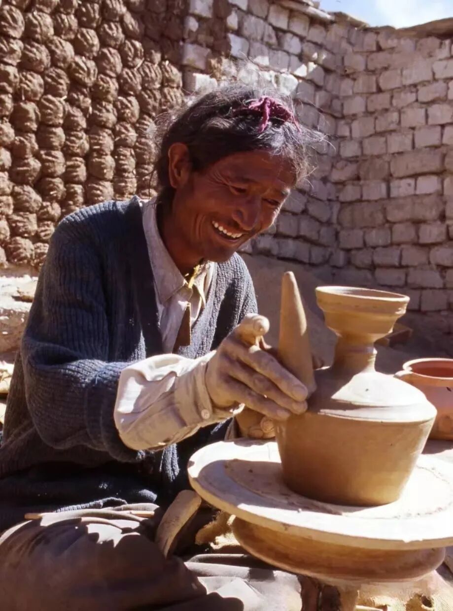 艺人制陶,足转陶轮,手里便出活儿。不时抿口青稞酒,得意之时,还哼小调提精神。