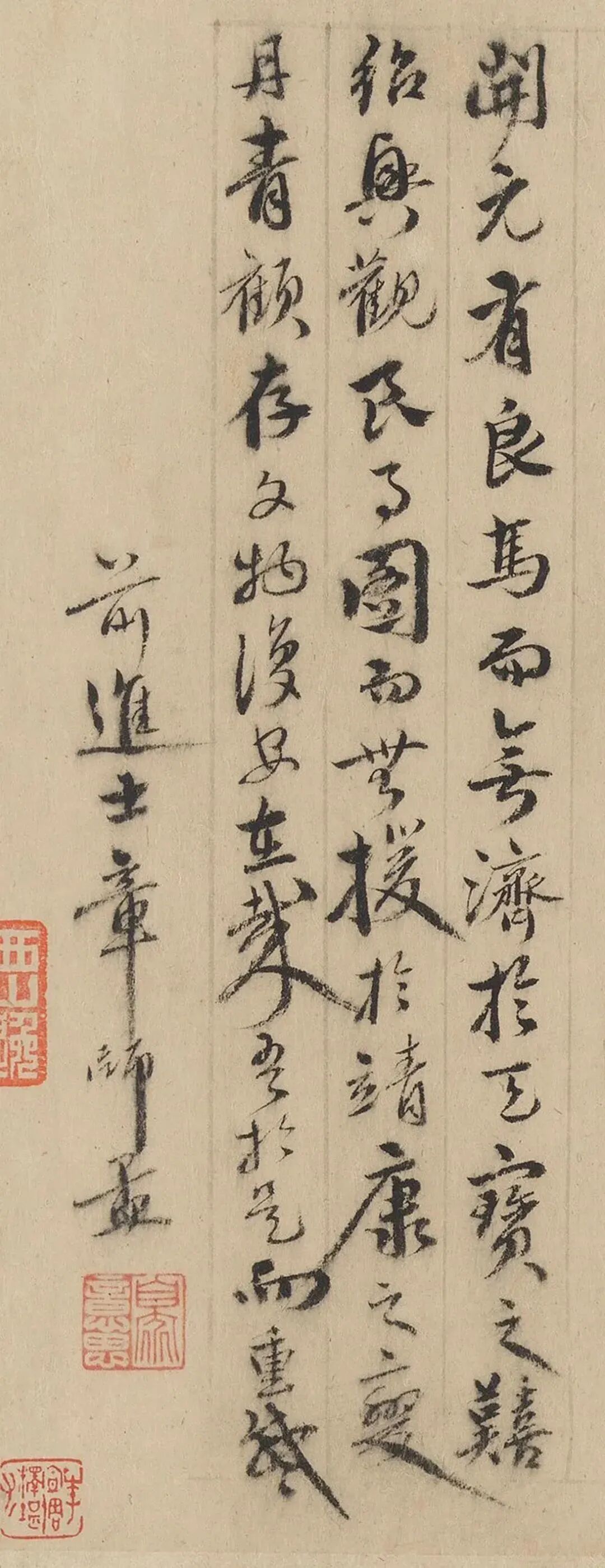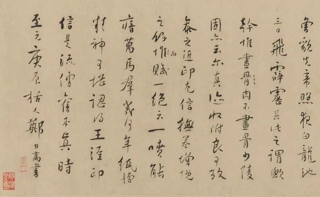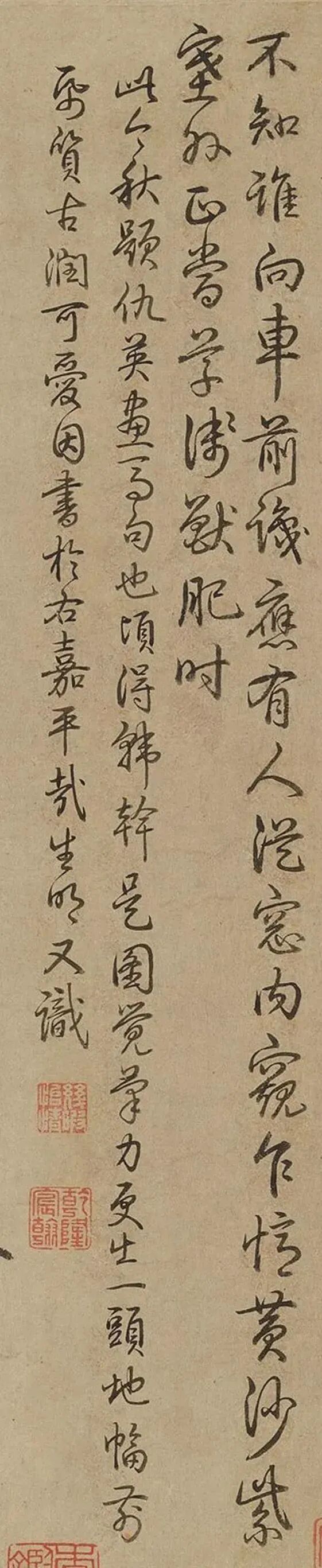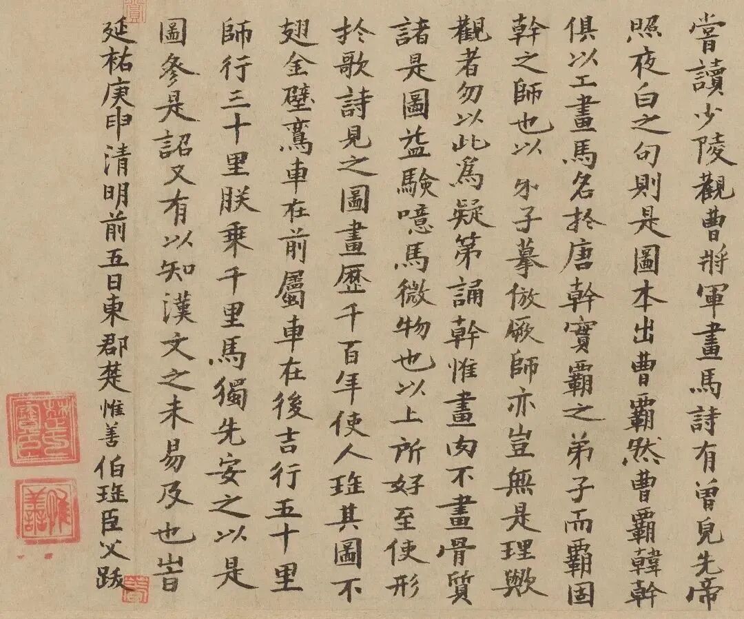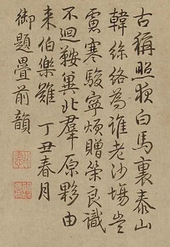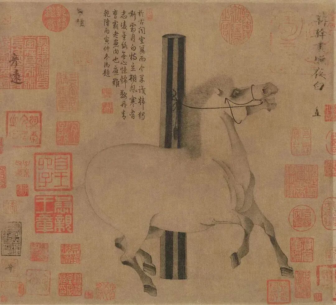 不知誰向車前識,應有人從窗内窺。乍憶黃沙紫塞外,正當草淺獸肥時。此今秋題仇英畫馬句也。頃得韓幹是圖,覺筆力更出一頭地,幅前紙質古潤可愛,因書於右。嘉平哉生明又識。