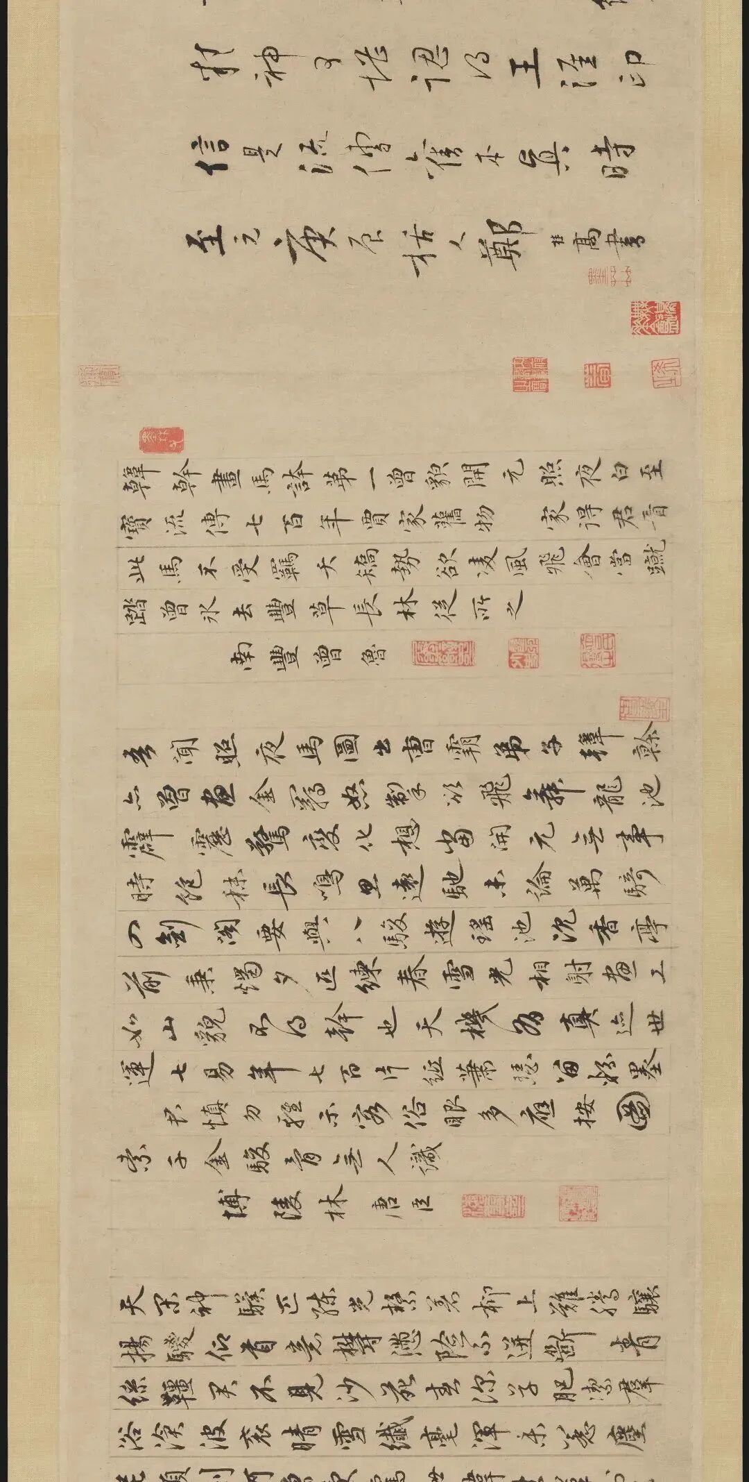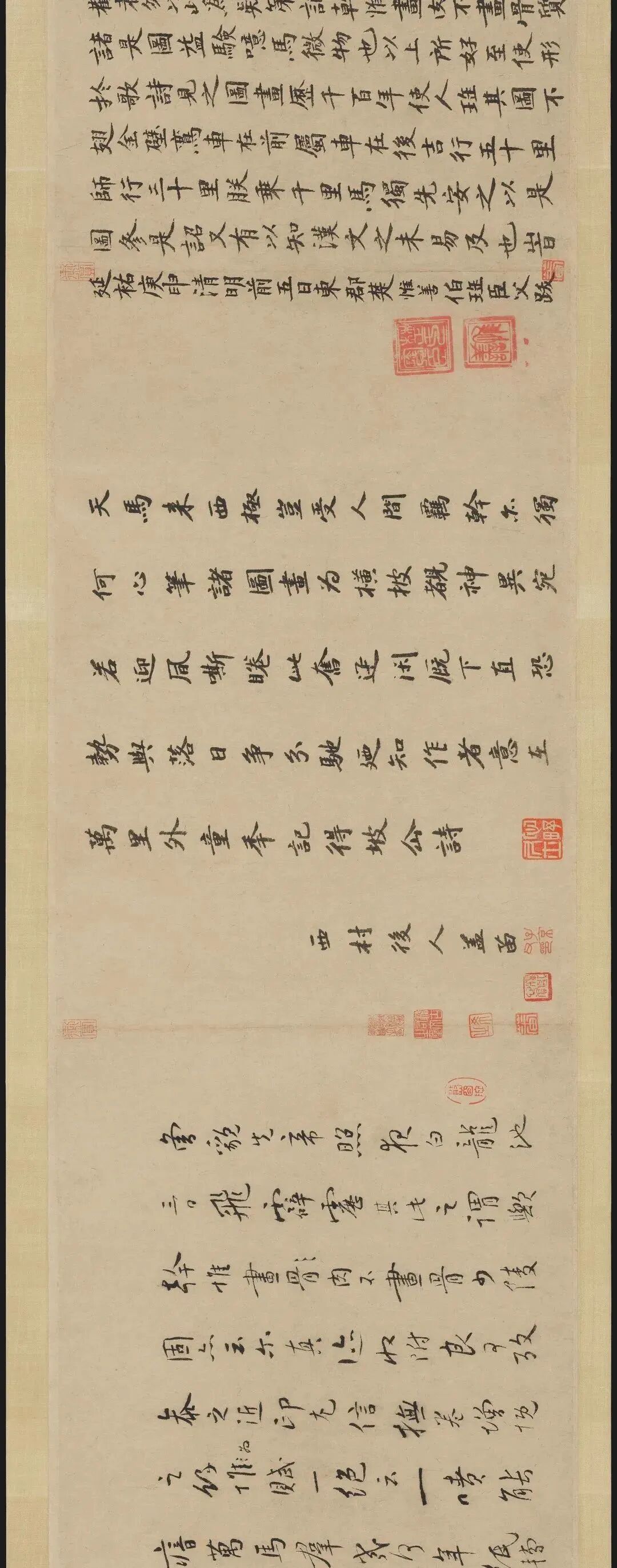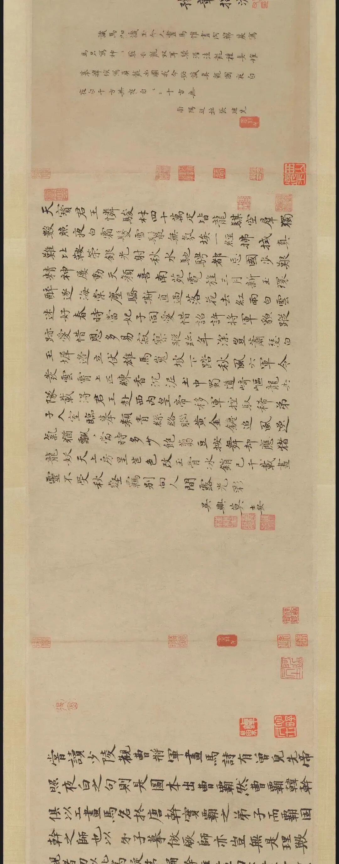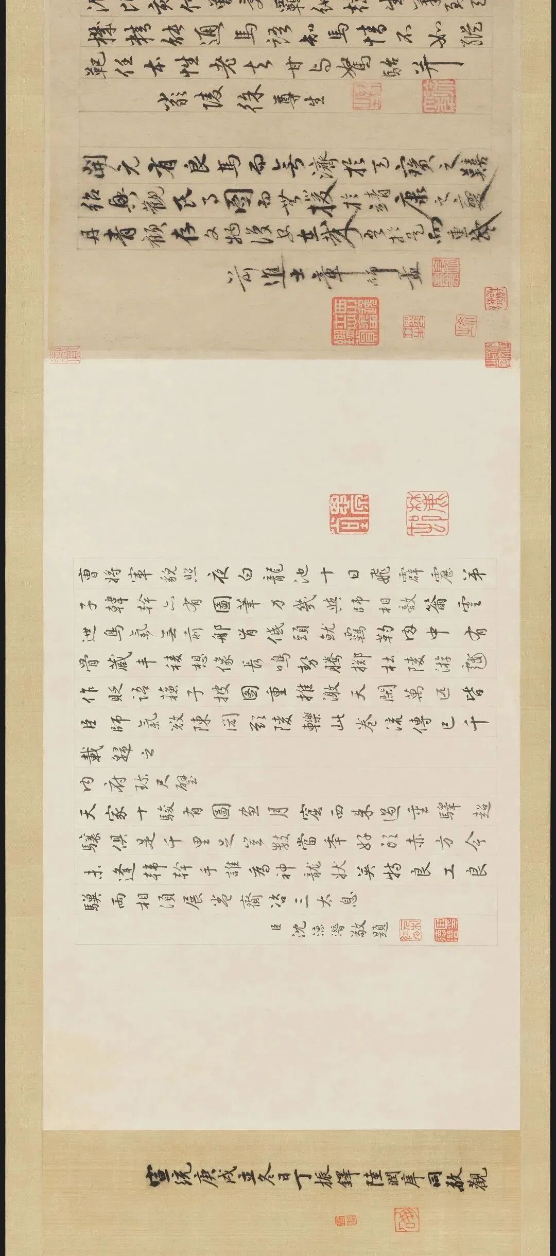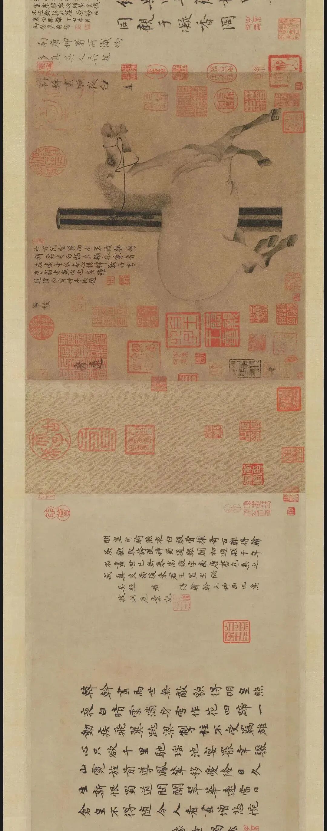 “曾貌先帝照夜白,龍池三日飛霹靂。”其此之謂歟。“幹惟畫肉不畫骨”,少陵固亦云尔。真迹收附良可攷,參之近印尤信。撫卷增慨之餘,為賦一絕云:“一噴能瘖萬馬群,幾何年紙轉精神。可堪認得王涯印,信是流傳舊本真。”時至元庚辰,括人鄭桂高書。