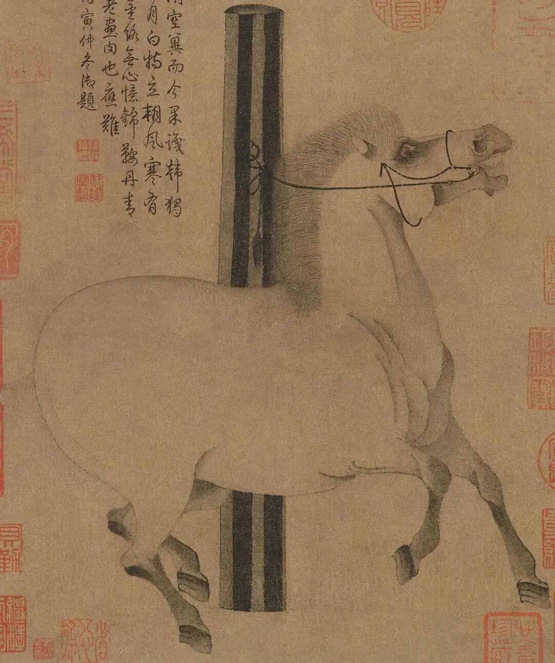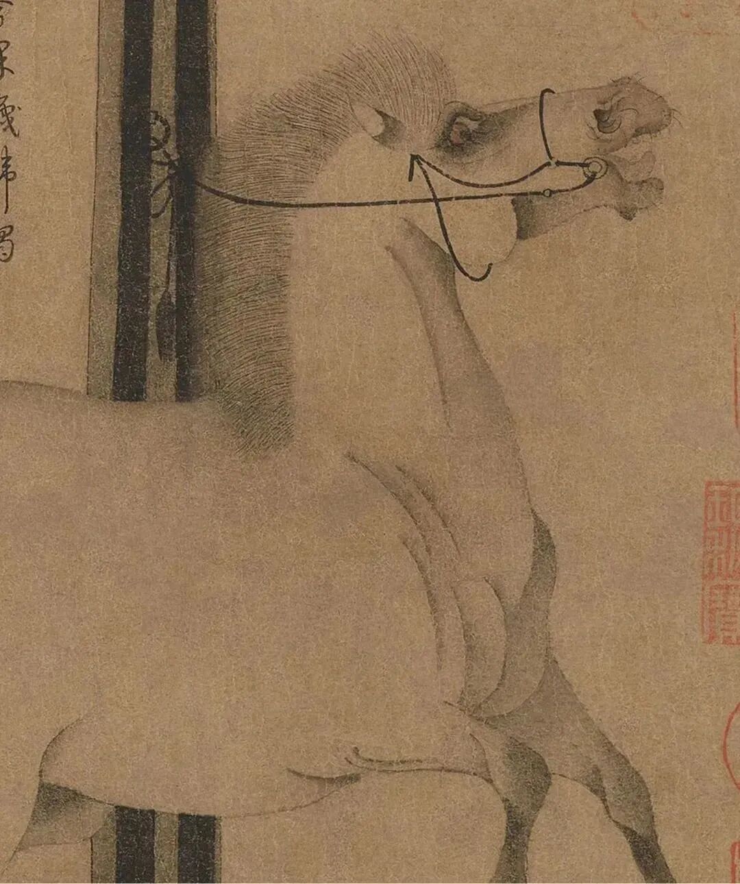 画中“照夜白”被系在一木桩上,鬃毛飞起,鼻孔张大,眼睛转视,昂首嘶鸣;四蹄腾骧,似欲挣脱羁绊,活灵活现的形态增强了马的腾跃动势,既真实地再现了“照夜白”形体的膘肥肌健,又生动刻画了此马腾蹄嘶鸣桀骜不驯的神态。这匹动态十足的马与居于画面正中的立柱形成了一动一静、一张一弛的对比,有一种节奏韵律感,加强了马身的力的美感。并且,从紧绷着的缰绳可以让人看出马与柱之间存在着一种自由与束缚的矛盾。