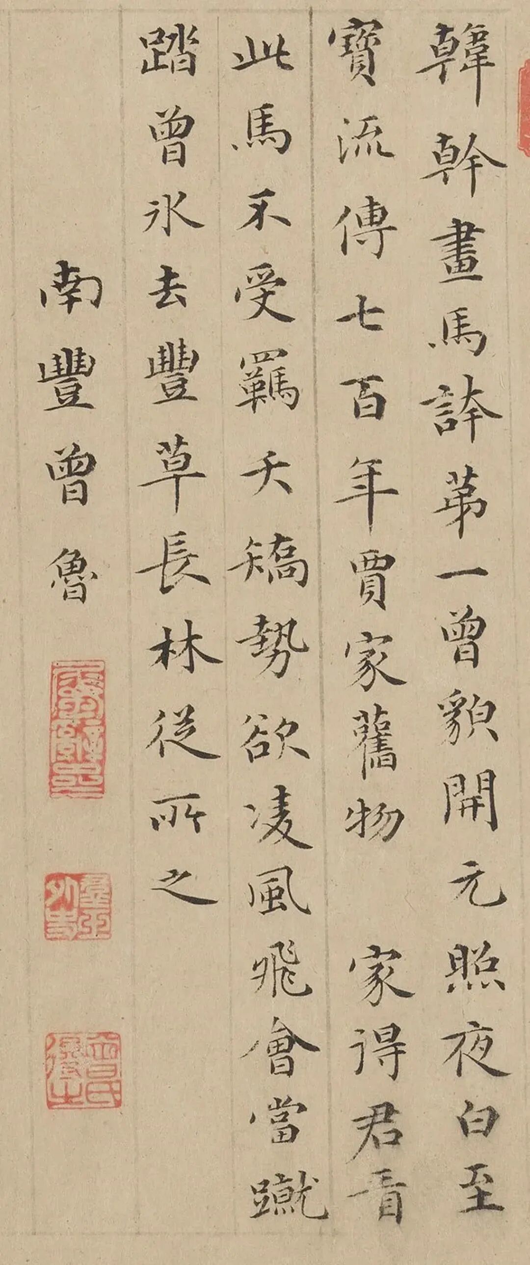 韓幹畫馬誇第一,曾貌開元照夜白。至寶流傳七百年,賈家舊物□家得。君看此馬不受羈,夭矯勢欲凌風飛。會當蹴踏曾冰去,豐草長林從所之。南豐曾魯。