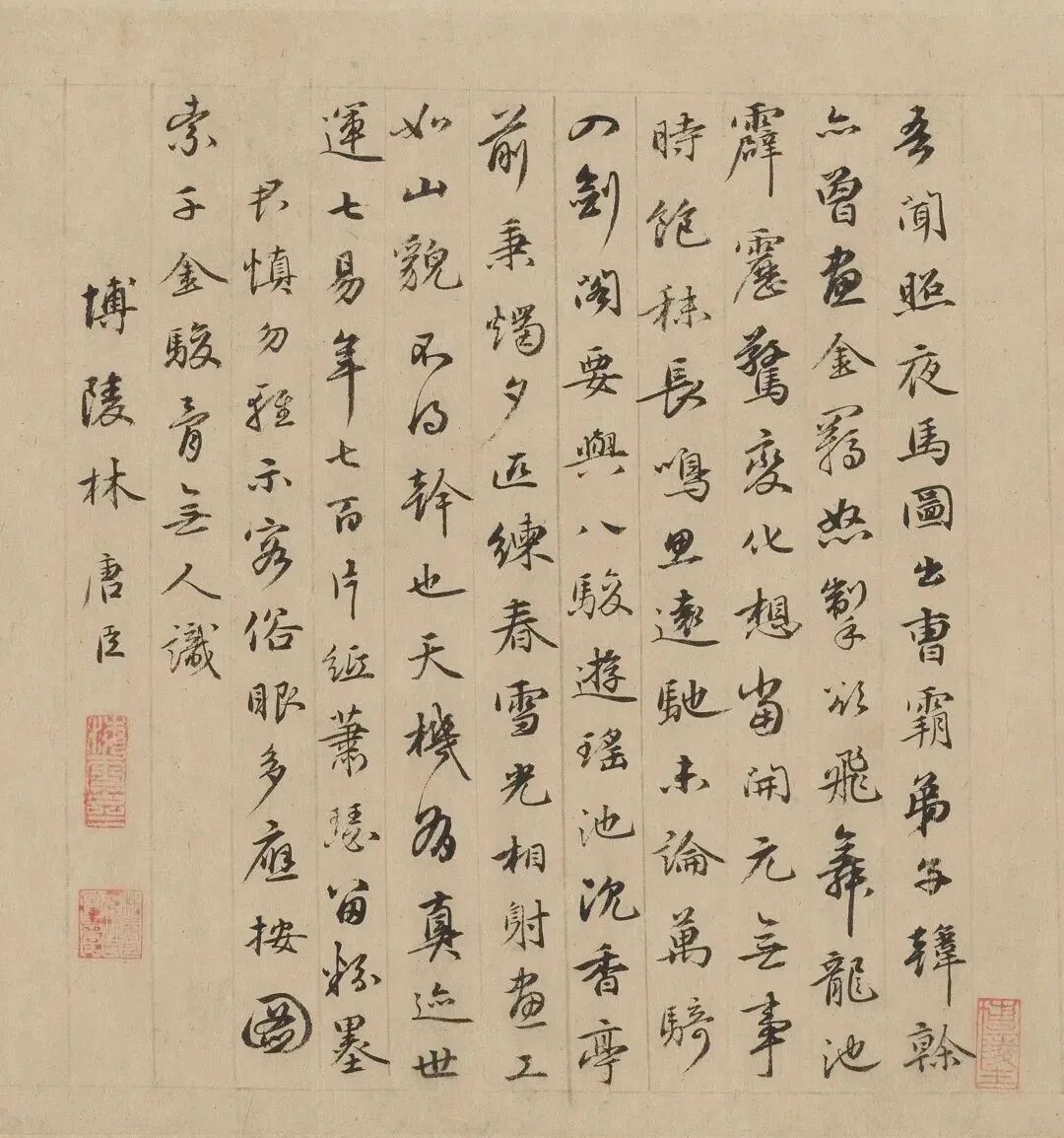 吾聞《照夜馬圖》出曹霸,弟子韓幹亦曾畫。金羈怒掣欲飛舞,龍池霹靂驚變化。想當開元無事時,飽秣長鳴思遠馳。未論萬騎入劍閣,要與八駿遊瑤池。沉香亭前秉燭夕,匹練春雪光相射。畫工如山貌不得,幹也天機有真迹。世運七易年七百,片紙蕭瑟留粉墨。□君慎勿輕示客,俗眼多應按圖索,千金駿骨無人識。博陵林唐臣。