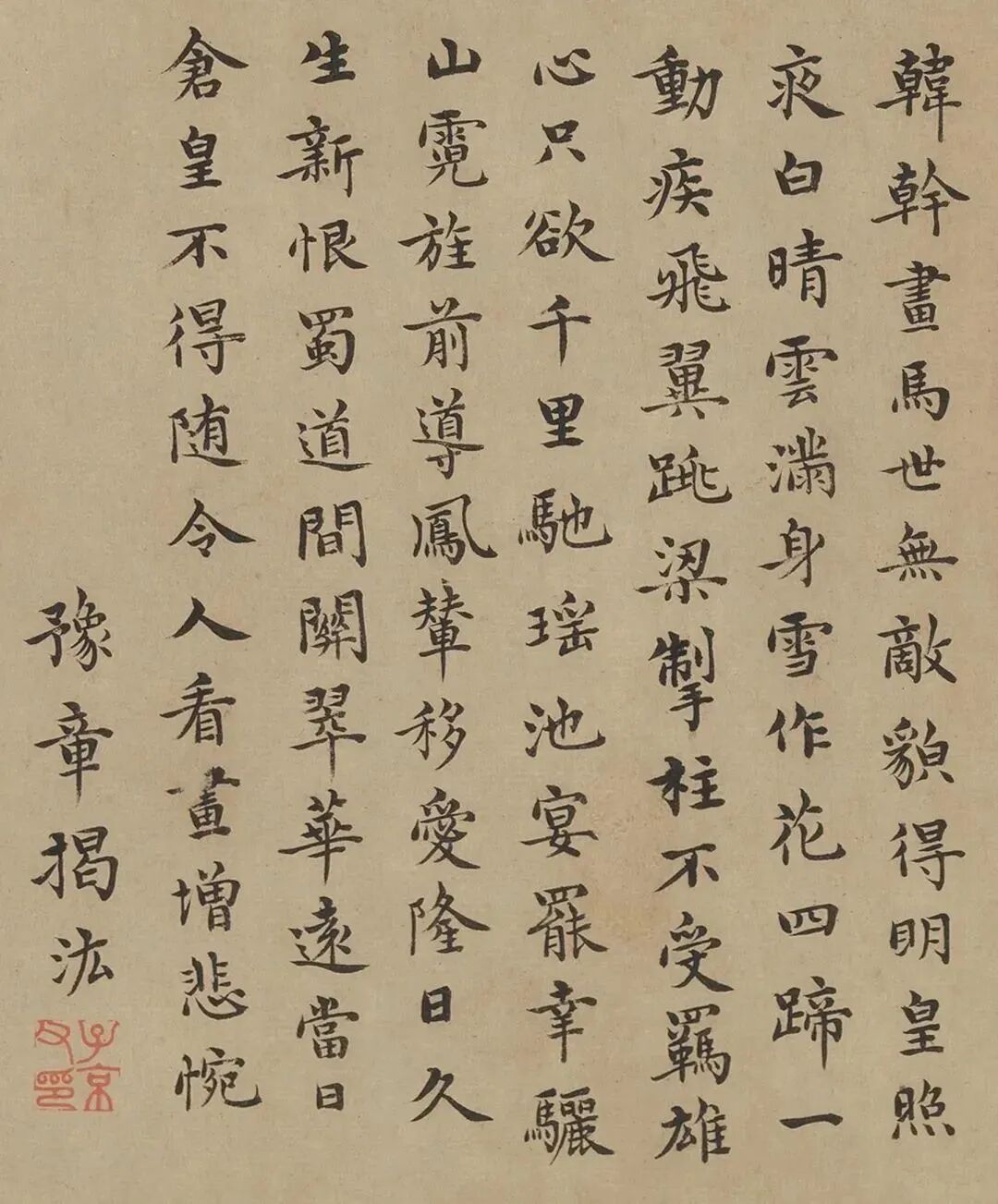 韓幹畫馬世無敵,貌得明皇照夜白。晴雲滿身雪作花,四蹄一動疾飛翼。跳梁掣柱不受羈,雄心只欲千里馳。瑤池宴罷幸驪山,霓旌前導鳳輦移。愛隆日久生新恨,蜀道間關翠華遠。當日倉皇不得隨,令人看畫增悲惋。豫章揭汯。