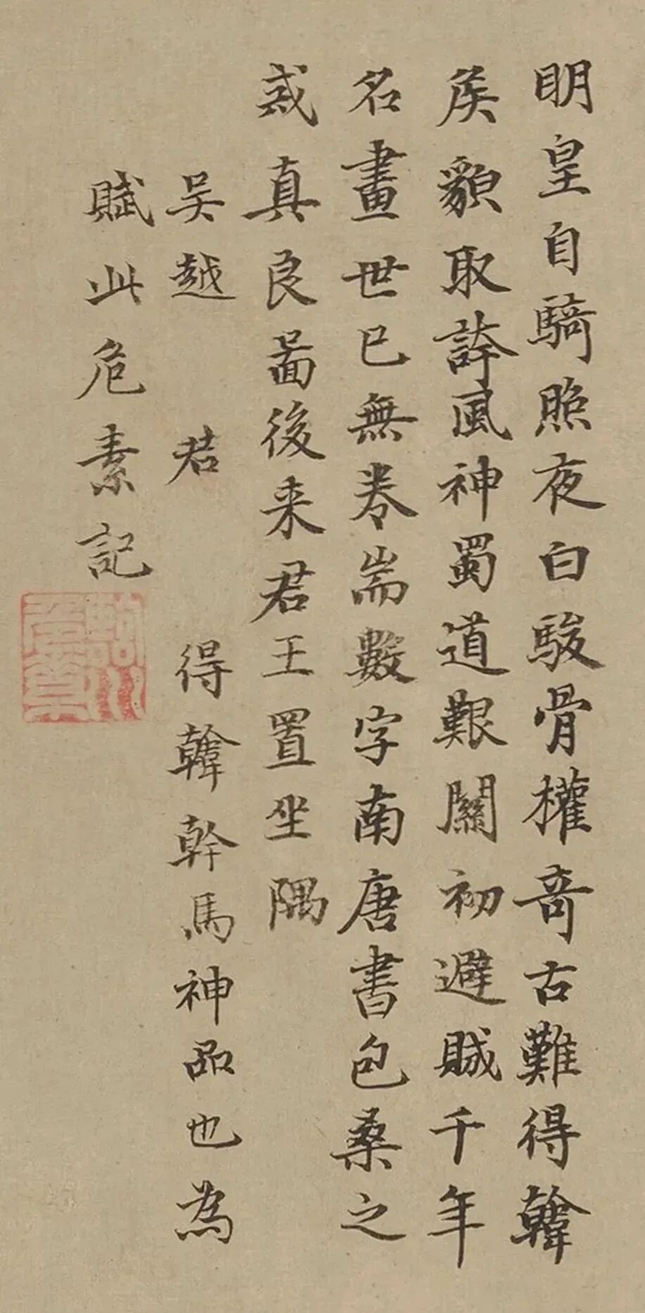 明皇自騎照夜白,駿骨權奇古難得。韓侯貌取誇風神,蜀道艱關初避賊。千年名畫世已無,卷端數字南唐書。包桑之戒真良圖,後來君王置坐隅。吳越□君□□得韓幹馬,神品也,為賦此。危素記。