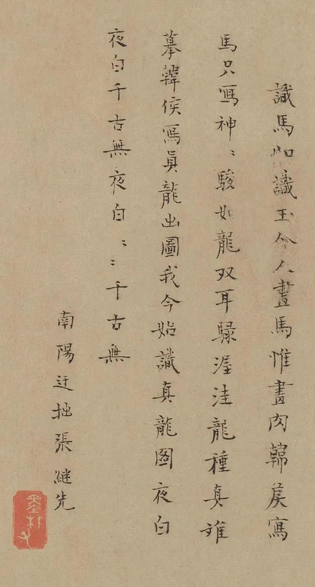 識馬如識玉。今人畫馬惟畫肉,韓侯寫馬只寫神。神駿如龍雙耳騄,渥洼龍種真難摹。韓侯寫真龍出圖,我今始識真龍圖。夜白夜白千古無,夜白夜白千古無。南陽迂拙張繼先。