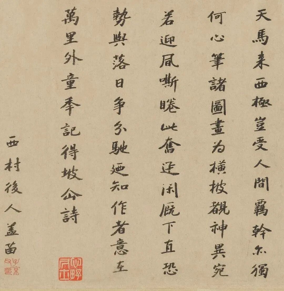 天馬來西極,豈受人間羈?幹亦獨何心,筆諸圖畫為。橫披覩神異,宛若迎風嘶。睠此奮迅閑廐下,直恐勢與落日爭分馳。廼知作者意在萬里外,童年記得坡仙詩。西村後人蓋苗。