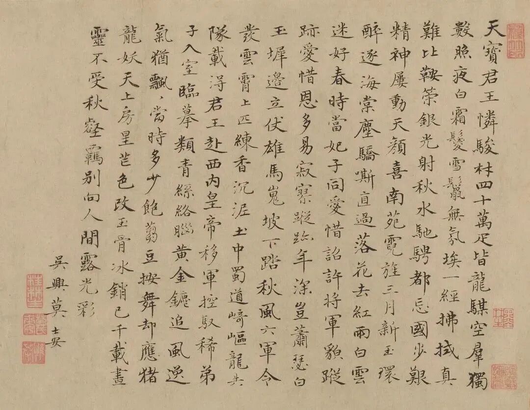 天寶君王憐駿材,四十萬疋皆龍[馬某]。空羣獨數照夜白,霜鬉雪鬣無氛埃。一經拂拭真難比,鞍策銀光射秋水。馳騁都忘國步艱,精神屢動天顔喜。南苑霓旌三月新,玉環醉逐海棠塵。驕嘶直過落花去,紅雨白雲迷好春。時當妃子同愛惜,詔許將軍貌蹤跡。愛惜恩多易寂寥,蹤跡年深豈蕭瑟。白玉墀邊立仗雄,馬嵬坡下踏秋風。六軍令發雲霄上,匹練香沉泥土中。蜀道崎嶇龍失隊,載得君王赴西内。皇帝移軍控馭稀,弟子入室臨摹類。青絲絡腦黃金鏣,追風逸氣猶飄飄。當時多少飽蒭豆,按舞却應豬龍妖。天上房星芒色改,玉骨冰銷已千載。畫靈不受秋壑羈,別向人間露光彩。吳興莫士安。