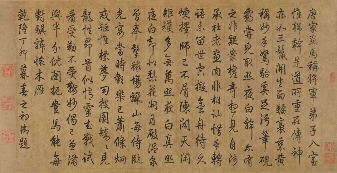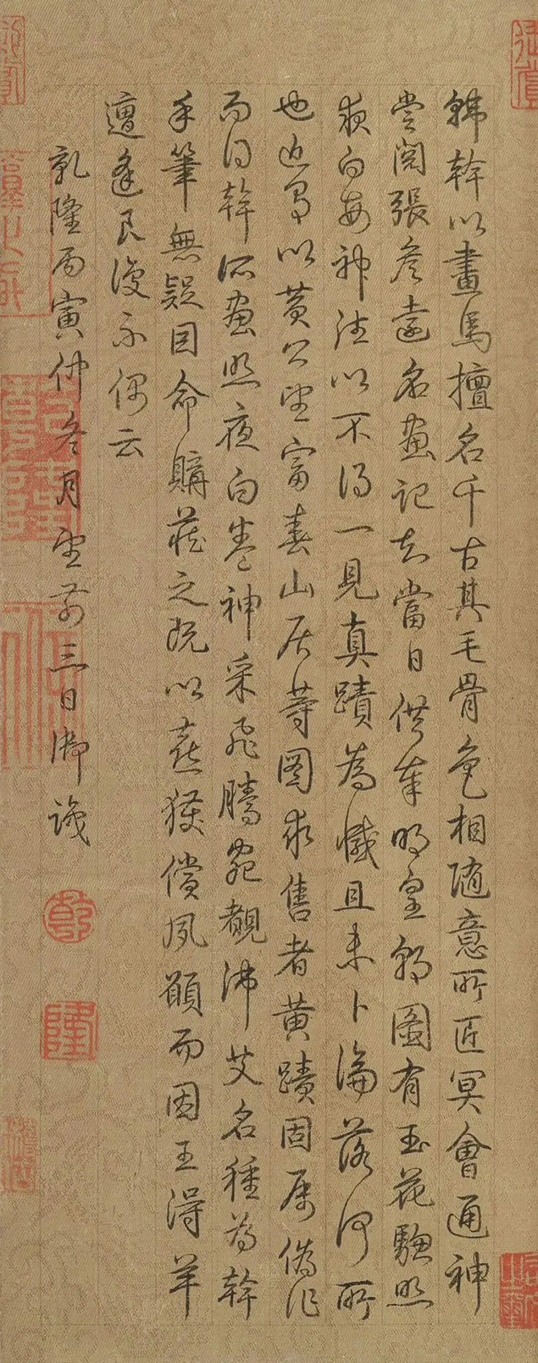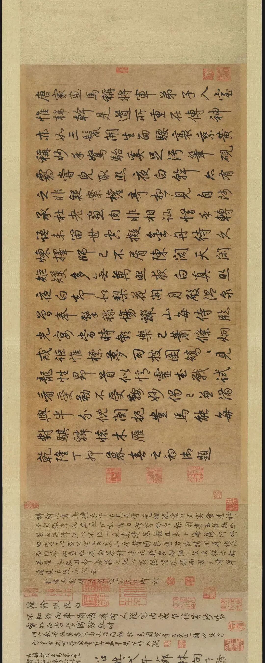 图右上方有南唐后主李煜题字,左上方有唐代著名美术史家张彦远题字,左下方有北宋米芾题名。画卷有宋代向子諲、吴说、张继先,元代盖苗、危素、揭汯,明代莫士安、曾鲁、徐尊生,清代乾隆皇帝、沈德潜等人题跋。