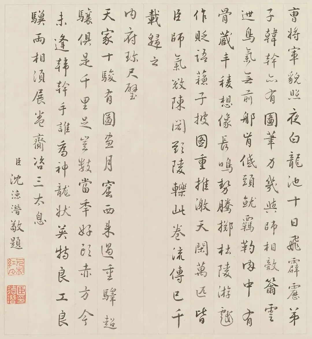 曹將軍貌照夜白,龍池十日飛霹靂。弟子韓幹亦有圖,筆力幾與師相敵。籋雲迣鳥氣無前,那肯低頭就羈靮?肉中有骨藏丰稜,想像長鳴勢騰擲。杜陵游戲作貶語,蘇子披圖重推激。天閑萬匹皆臣師,氣敓陳閎欲陵轢。此卷流傳已千載,歸之内府珍尺璧。天家十駿有圖畫,月窟西來過重驛。超驤俱是千里足,豈數當年好頭赤。方今未逢韓幹手,誰為神龍狀英特。良工良驥兩相須,展卷齎咨三太息。臣沈德潛敬題。