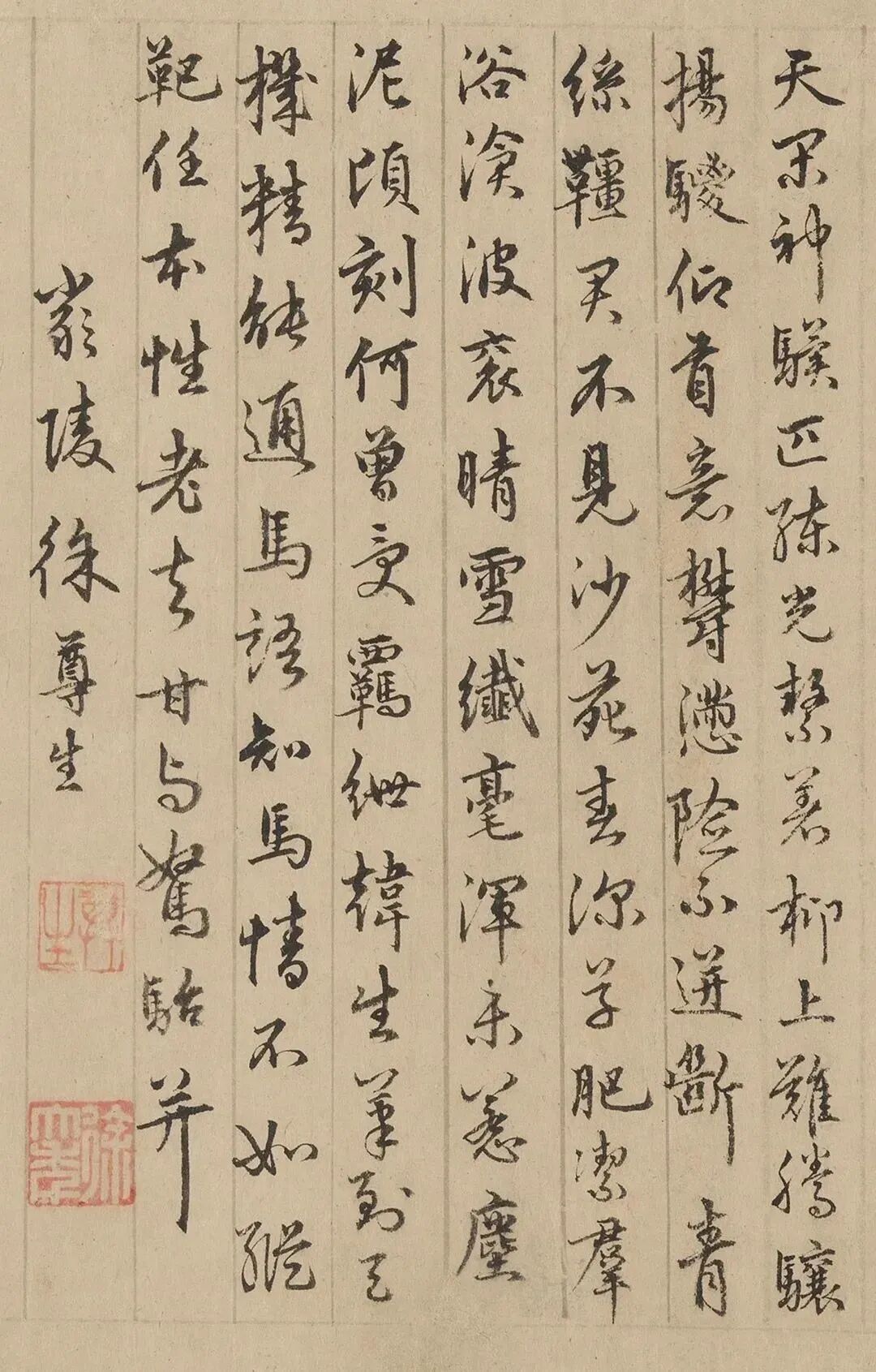 天閑神驥匹練光,繫著柳上難騰驤。揚騣仰首意鬱懣,險不迸斷青絲韁。君不見沙苑春深草肥潔,羣浴滄波袞晴雪。纎毫渾未惹塵泥,頃刻何曾受羈紲。韓生筆到天機精,能通馬語知馬情。不如縱靶任本性,老去甘與駑駘并。嚴陵徐尊生。