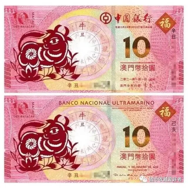 这套纪念钞的发行规格比较少见,是成对发行的,所以也称为生肖对钞。在此之前,澳门已经发行了龙、蛇、马、羊、猴、鸡、狗、猪、鼠、牛10个生肖钞,加上即将发行的虎和兔,正好凑齐一轮!