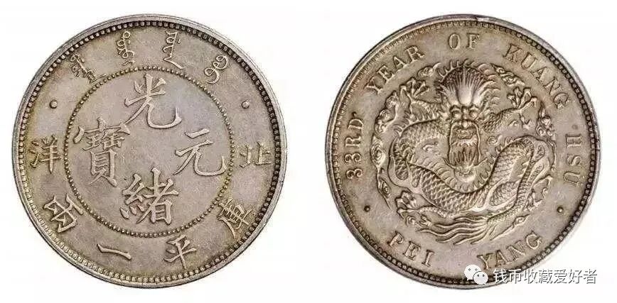 光绪三十三年,又铸造出了北洋库平一两,“北洋库平一两”的设计与户部一两雷同,正面除将“户部”两字改成“北洋”外其余相同;背面则是将英文年号、由发行别“hu poo”变更为制作厂别“pei yang”而已。这两种一两银币,都是该铸币厂的珍品,难得一见。
