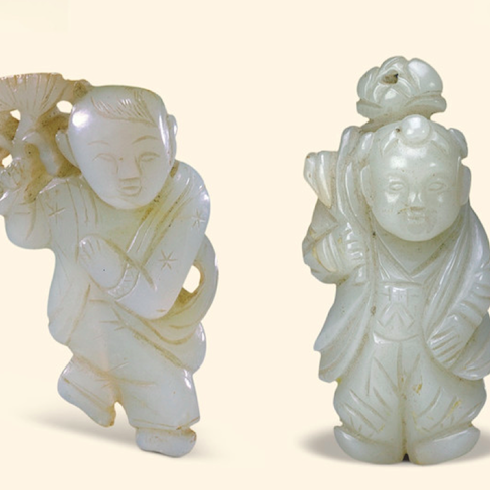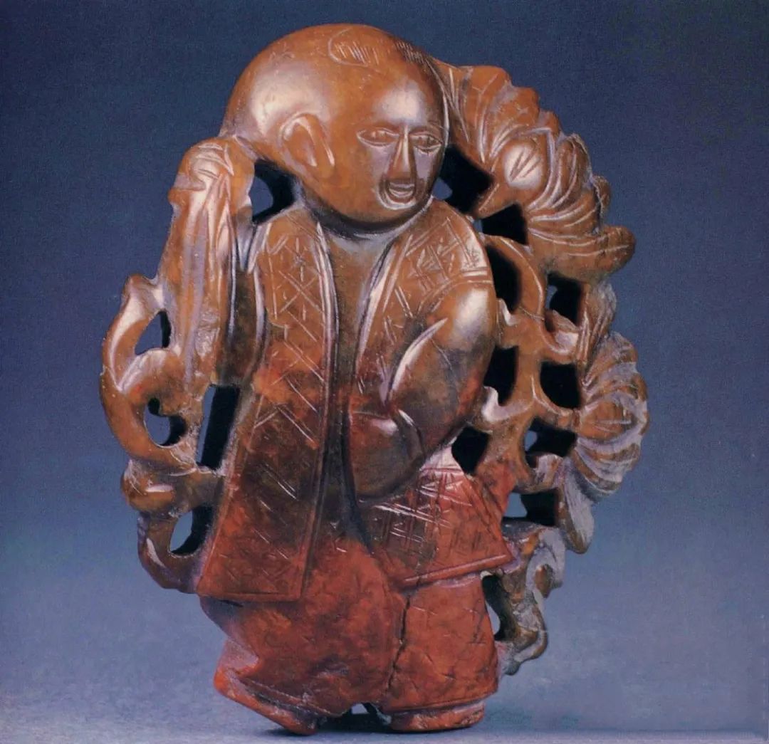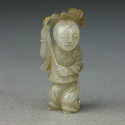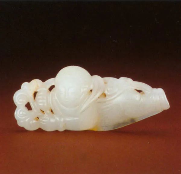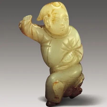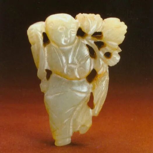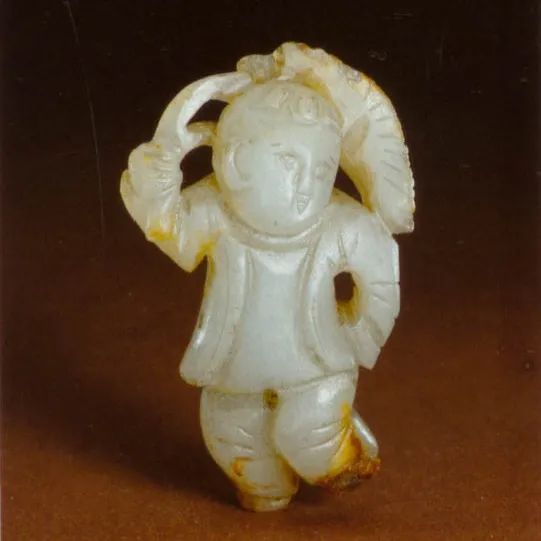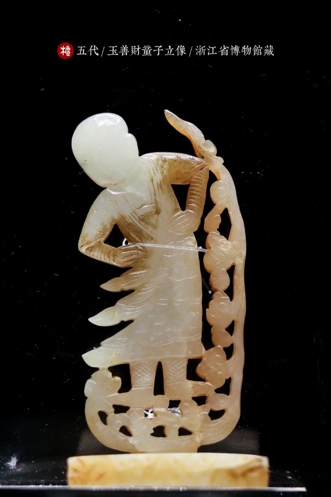 浙江省博物馆藏五代玉童子高9.5cm,身着宽衣,腰间系带,站立在漂浮的云彩之上,一幅怡然自得、天真自信之态。资料称此童子是我国目前发现年代最早的童子雕像,开历代玉童子之先河。