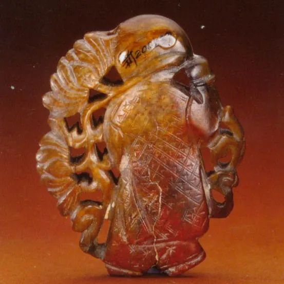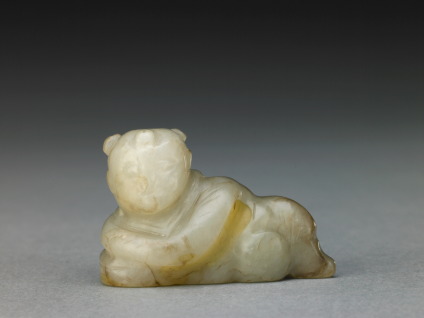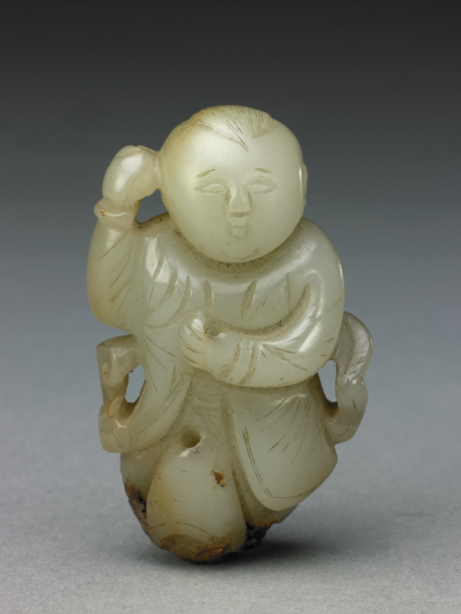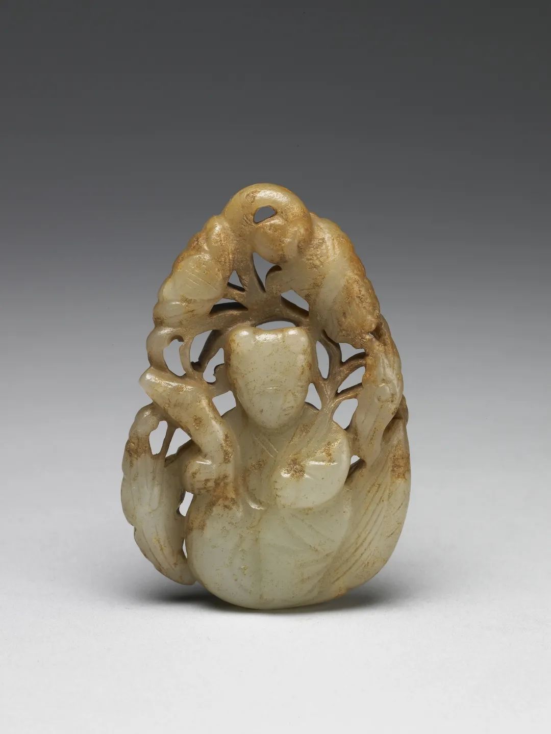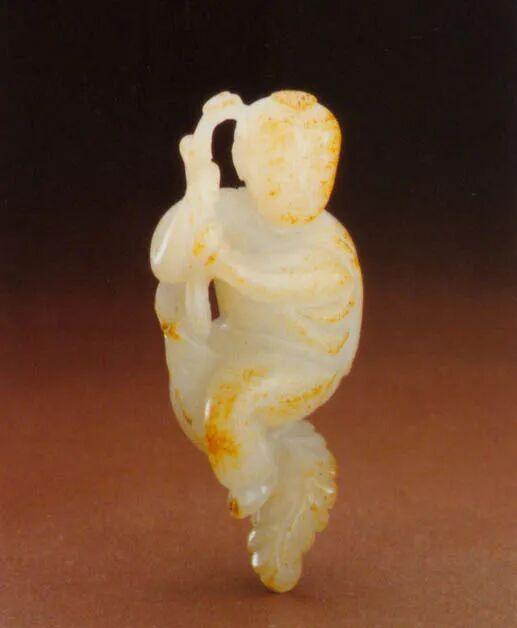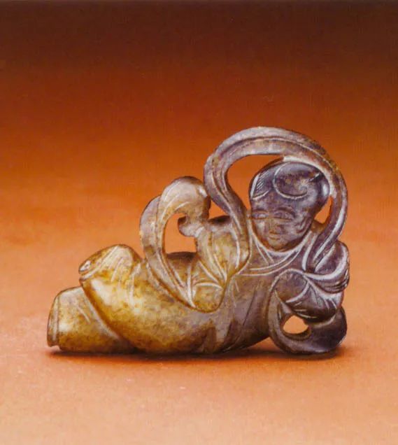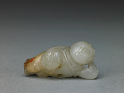 宽3.4公分。白玉沁褐,立雕一人,呈趴卧状,双手向前环胸,衣服飘带飞扬。整体造形圆滑,以简单线条刻划五官,阴刻线条较粗,轮廓明显。