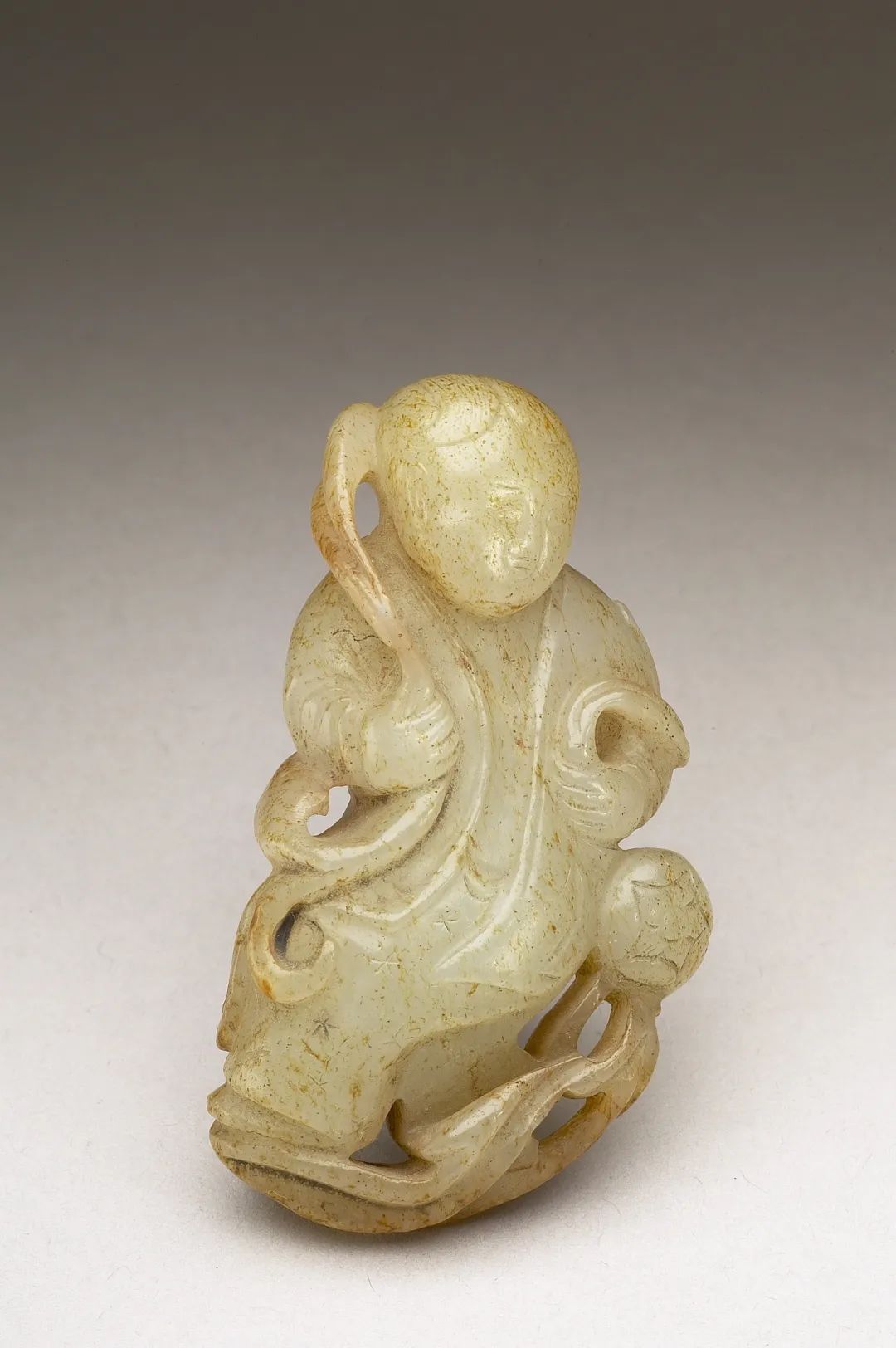 此外还有骑鹅童子。鹅在古代代表着家庭富足,小童子骑着鹅既显顽皮童趣,又寓意家庭富足美满、子孙绵延。