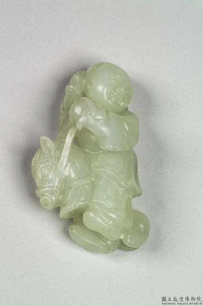 白玉。全器雕立姿孩童骑木马,笑容可鞠,双手执绳。