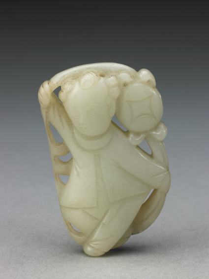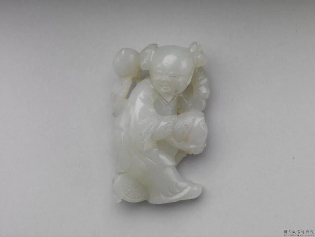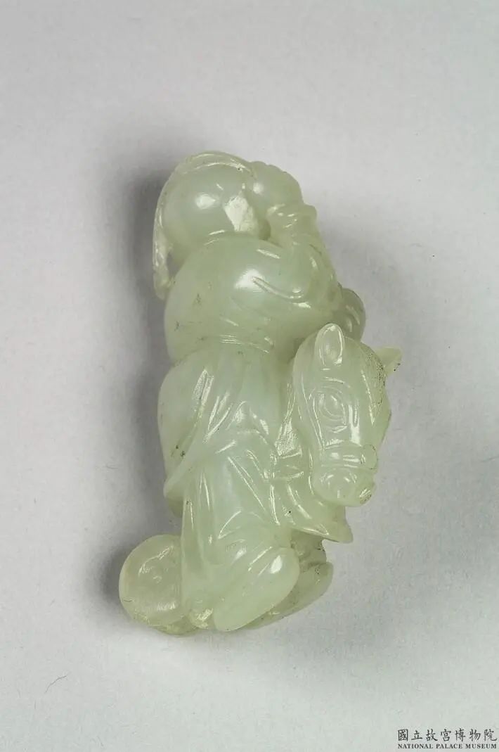 高5.3公分。白玉,立雕一童子,梳双髻,穿著交襟长上衣及长裤,身披一彩带,背一有桃实的桃枝,骑有轮的竹马。表情愉悦生动,衣饰线条细腻精致,一丝不紊。