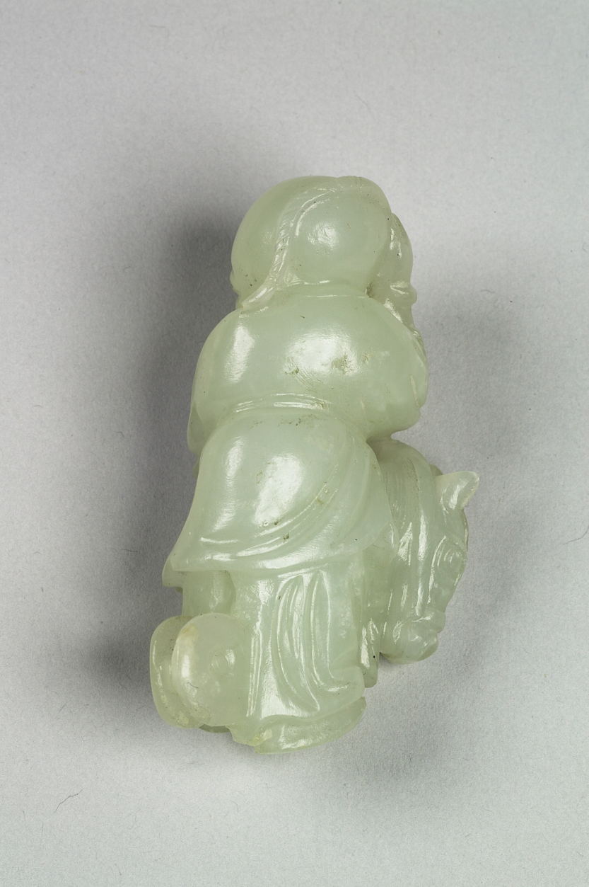 高6.1公分 宽3.2公分。玉质,琢立姿童子。面带笑意,一手持荷蓬,骑乘木马。