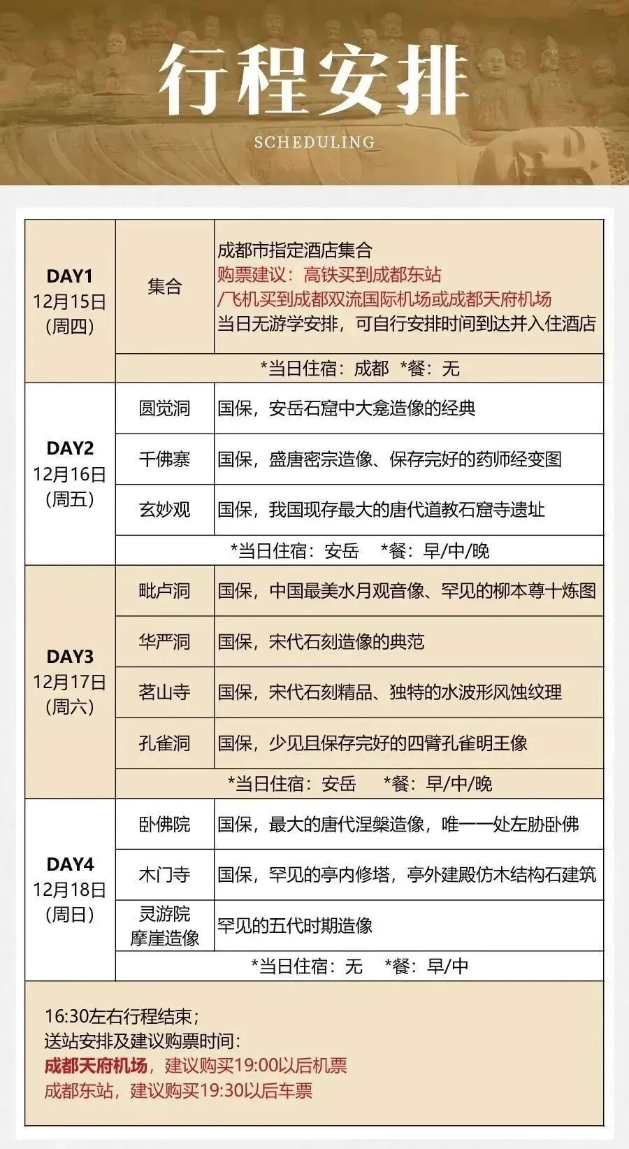 图源/四川再发现(安岳县文广旅局)虽然亭子的柱、枋、檐、脊、斗拱、熬头、房瓦、滴水、椽子等构件均为石制,但外观却与木制无异,可谓巧夺天工,精妙绝伦,是现代建筑学者和雕刻艺术家研究、鉴赏不可多得的历史实物。我国罕见的五代时期造像。它依随山崖走势而建,有龛窟17个,造像900多尊。他的题材非常丰富,不仅可以看到地藏、观音菩萨、500罗汉等,也有部分是佛道合龛。除了石刻造像以外,灵游还有很多碑刻题记,开龛造像年代清晰,对四川摩崖石刻的分期断代有着重要的作用。适合人群 :石窟艺术爱好者/访古者/历史人文爱好者/佛教美术从业者/考古与历史专业人员报名人数达到上限将停止招募,名额有限,请尽快报名!*报名需二次确认。请不要购买高铁/机票大交通,待客服通知成行后再安排购买。费用包含2.住宿:3晚四星酒店住宿(默认标间,如需单房请联系客服小艺补单房差,单房差:480元/人) 4.导服:专业讲师随行讲课+文化领队贴心服务+专职司机*单房差说明:默认标间(1间房2个人),如需单独一间房,联系客服补单房差即可。1.因疫情或其它原因,由艺旅文化取消的行程无条件退还团费100%;