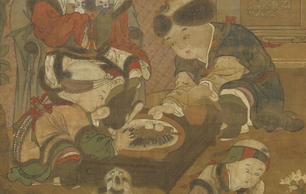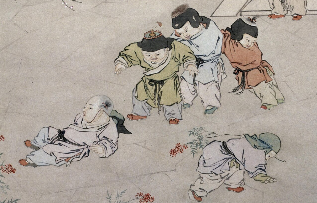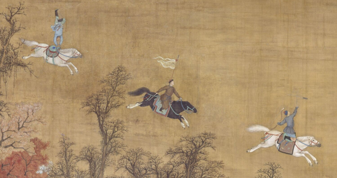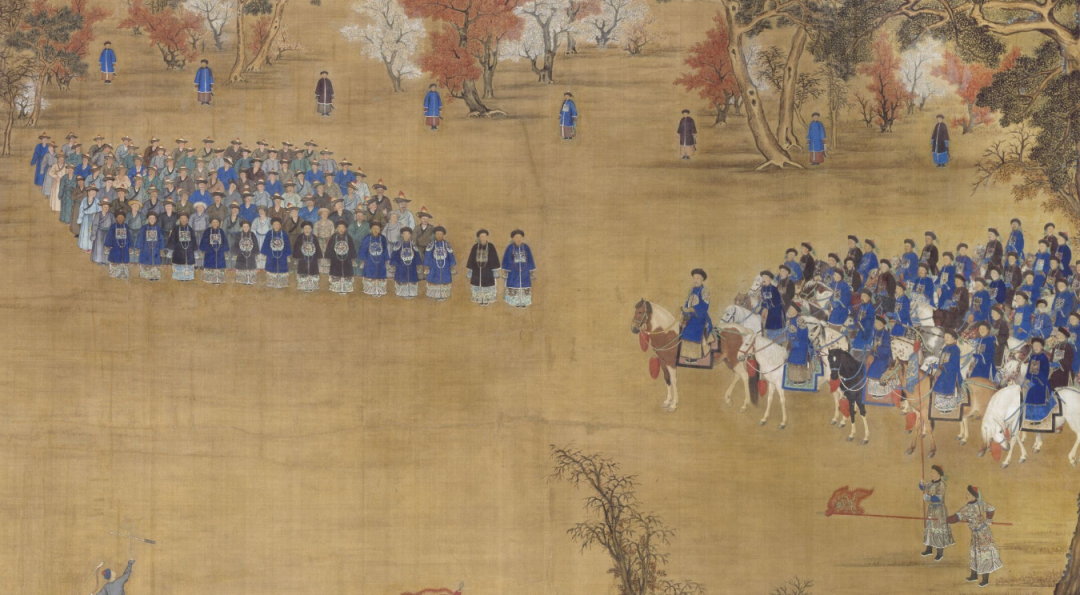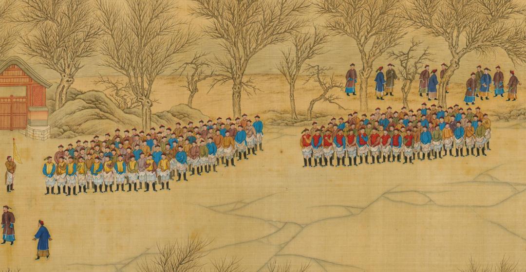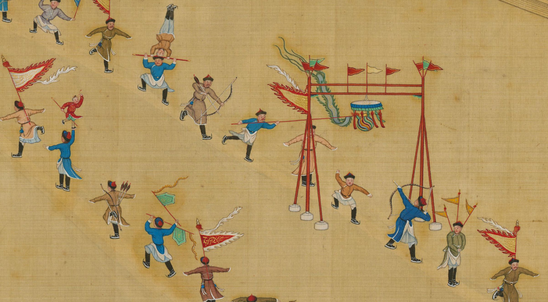 “至冬至后,驾幸瀛台等处,陈设冰嬉及较射天球等伎。分兵丁二翼,每翼头目二十名,服红黄马褂,余俱服红黄齐肩褂。射球兵丁一百六十名,幼童四十名俱服马褂,背小旗,按八旗各色以次走冰较射。”
