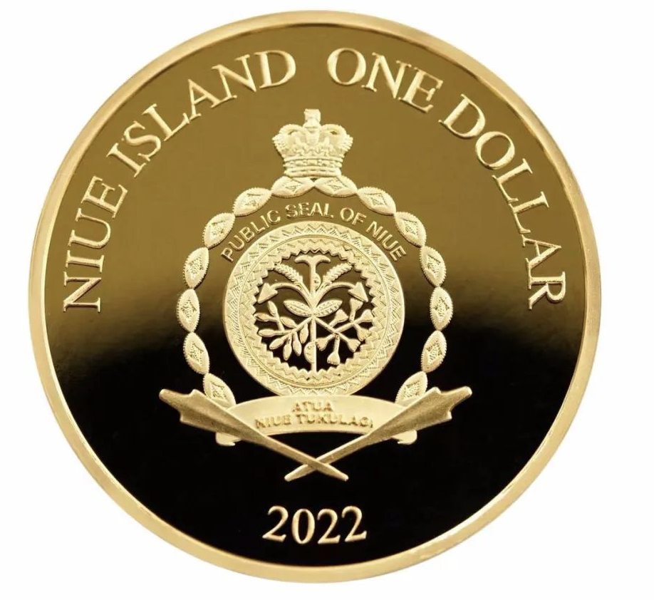 银币的正面图案是发行国家纽埃的国徽和发行年份、面值等信息。