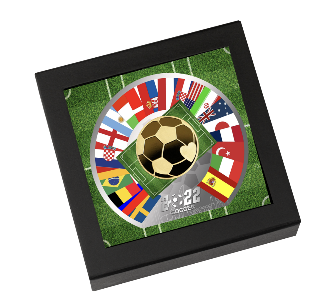 这枚纪念币的外包装很有意思,做了个绿茵球场的设计,而这枚纪念币正好嵌入其中,周围环绕着参赛国的国旗。一场“争夺”拉开序幕!