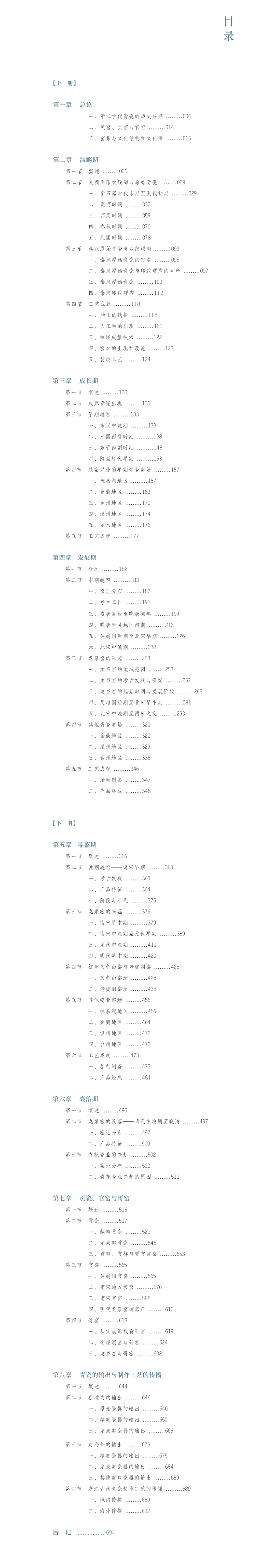 青瓷是最早的瓷器品种,浙江是青瓷的故乡,也是古代世界主要的青瓷产地。浙江古代青瓷,不仅历史久远,遗存丰富,海内外的发现既多且广,学界的研究成果也甚为丰硕,但囿于各种条件,通史类专著阙如既久。1988年,我从厦门大学考古专业毕业,入职浙江省文物考古研究所。其后,十有余年,主要师从前辈从事瓷窑址考古与古陶瓷研究。承领导与同事们垂青,1999年,忝列副研究馆员之末。2005年,奉调浙江省文物局。角色转换,不再跻身田野考古一线,但陶瓷情结未泯。期间,除赴美研读一年外,对最新考古发现,尤其是窑址考古发现,始终保持着关注的热情;对于新的研究成果,似乎也无意兴阑珊之困。蒙同仁和友人们厚爱,得以观摩大量陶瓷实物,并在交流探讨中受益良多。然而,虽所思所想常有,述作却不常有。正因为如此,2019年,浙江文化研究工程之“浙江考古与中华文明”课题立项,时任浙江省文物考古研究所所长刘斌先生邀约承担“浙江古代青瓷”研究时,颇费踌躇,斟酌再三后,方才偕同谢西营、张馨月二位,接受这一颇具挑战性的任务。我们开展课题研究的思路是:以海纳百川的胸怀,吸纳既有考古与研究成果,在此基础上,采用新材料,选取新视角,运用新方法,得出新结论;书稿撰写,有主有次,力求系统性、科学性和创造性。我们以浙江古代青瓷发展历史为主线,划分出滥觞期、成长期、发展期、鼎盛期和衰落期等五大历史时期;以官民两系中的“官”为辅线,还原贡瓷、官窑和哥窑的演化历程;以产品输出和工艺传播为次辅线,介绍青瓷流布与技术辐射范围。我们的论述,以考古资料为基础,其中又以窑址考古材料为主,文献史料结合使用。我们追求论证的逻辑性,结论的严谨性,对于陶瓷科技考古成果,在有所甄别的同时,尽可能参考借鉴;对于每个历史时期的工艺成就,均做专门总结,并注重剖析产品特征与工艺变化的互动关系。研究方法方面,除了传统的考古学和史学视角外,还采用了工艺学、经济学、文化人类学等多学科视角。我们特别引入文化结构和文化圈(文化传播)的研究方法,分析总结浙江古代青瓷的时代特征、地域特色和窑业体系。根据上述思路,我们系统梳理了浙江古代青瓷的发展脉络,对各时期、各阶段青瓷的窑场分布、发展轨迹、产业兴衰、产品特征、工艺成就等,做了尽可能完整的呈现。对于学界长期关注的问题,诸如原始青瓷工艺曾否中断、越窑历史时期与阶段的划分、越窑与龙泉窑的承接转换、乳浊釉青瓷的渊源流变、龙泉窑的起始年代、龙泉窑黑胎青瓷的性质、贡瓷与置官监窑、龙泉窑和老虎洞窑与哥窑的关系、明代龙泉窑是否存在御器厂等,均阐述了我们的认识提出了一系列新观点,并予以论证,诸如越窑衰落与产业转移相伴随、秘色瓷含义有“两个不一样”、龙泉窑淡青釉与翠青釉青瓷有共存期、吴越国官窑是具有一定垄断性的官营手工业、余姚官窑运行采取官民合作方式、南宋官窑设立以临安府官窑为基础、南宋官窑系青瓷工艺历经三阶段演进、哥窑缘于“仿官”风尚等。因为学力不济,又有课题时限之约,研究想达成理想目标,殊属不易,难免理想丰满、现实骨感之憾。尽管如此,依然期待,即便作为了解浙江古代青瓷的工具书,本书也能对读者诸君略有助益。敬请考古界、史学界、博物馆界、工艺美术界以及海上丝绸之路研究、非物质文化遗产保护传承、陶瓷鉴赏等领域的人士批评指正。书稿撰写采取合作的方式,执笔分工如下:第一章,第四章第一至第三节、第五节,第五章第一至第四节、第六节,第七章,郑建华;第二章,张馨月;第三章,第四章第四节,第五章第五节,第六章,第八章,谢西营。全书框架构思和统稿工作由郑建华负责。