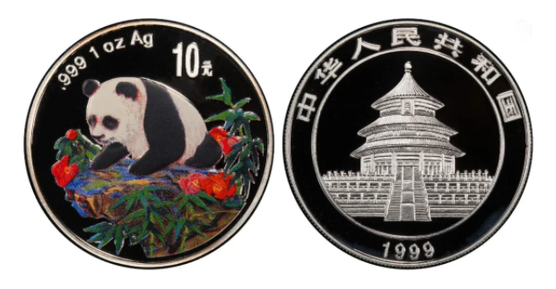 我国仅在97-99年这3年发行过彩色熊猫币,97年1盎司和1/2盎司;98年1盎司;99年1盎司和1/2盎司。今天小藏给大家带来是熊猫币“五朵银花”中的关门币——1999年彩色熊猫银币1盎司!