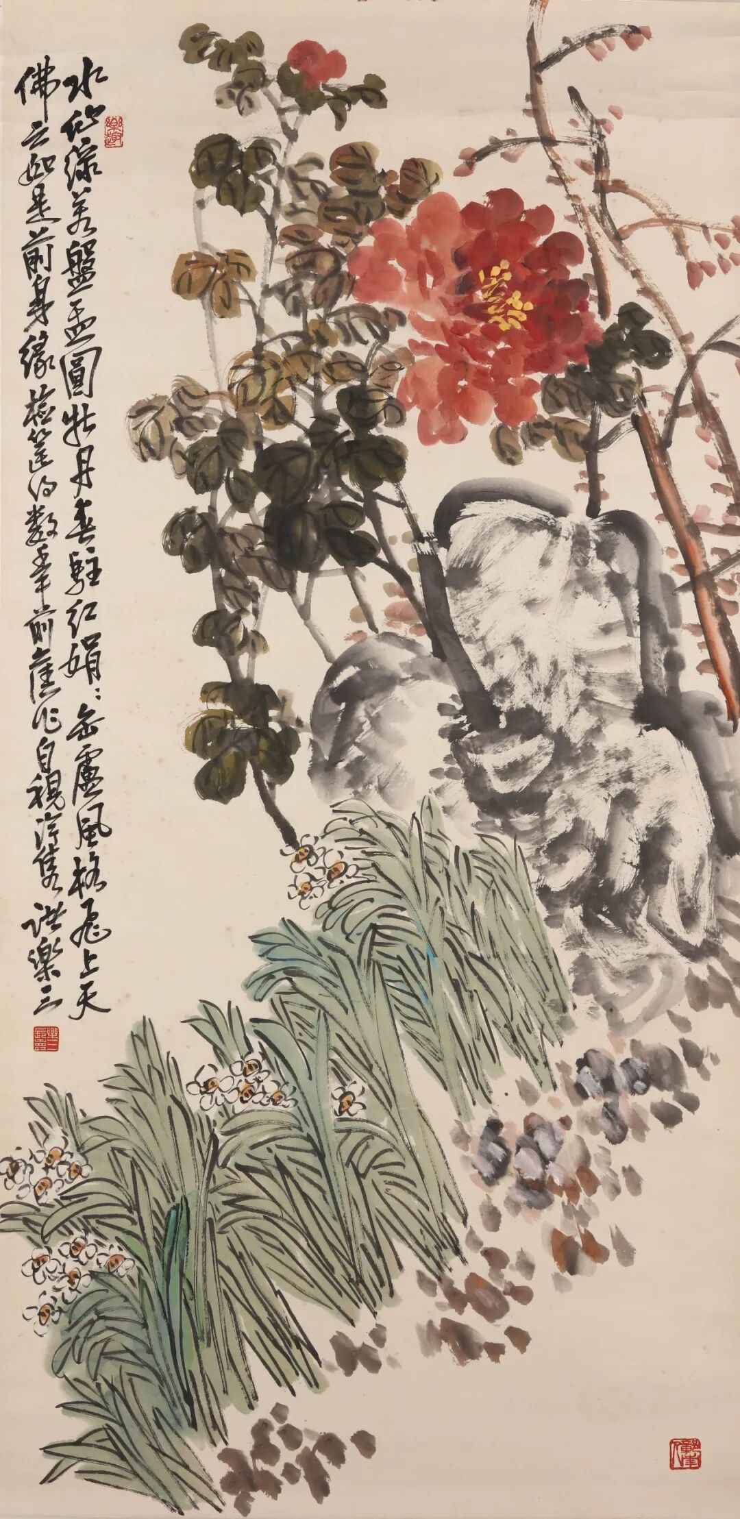 题识:水仙绿若盘盂圆,牡丹春驻红娟娟。缶庐风格飞上天,佛云为是前身缘。检筐数年前旧作,自视冷隽。诸乐三。