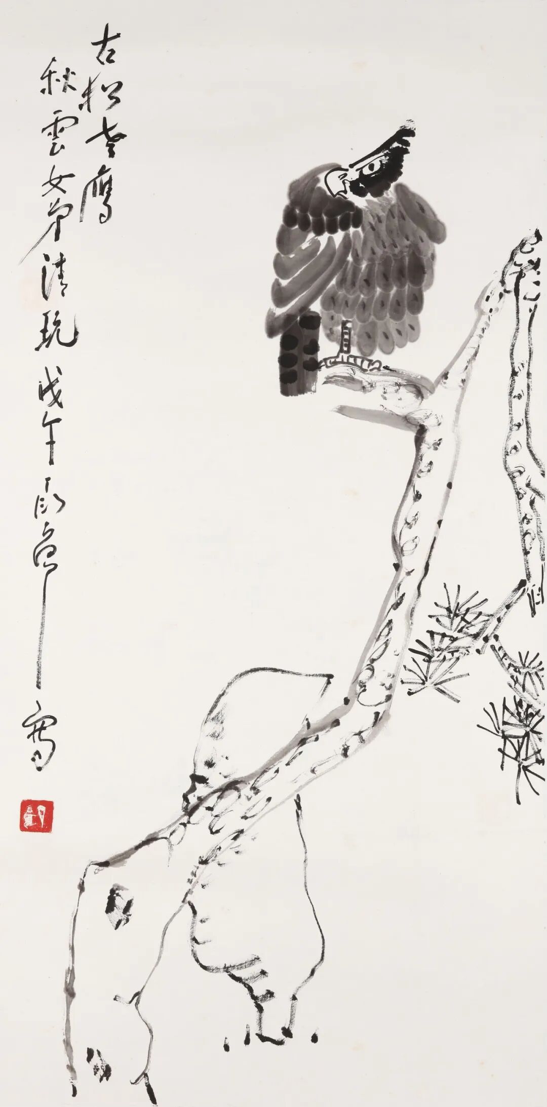 题识: 古松老鹰。秋云女弟清玩,戊午丁衍庸写。