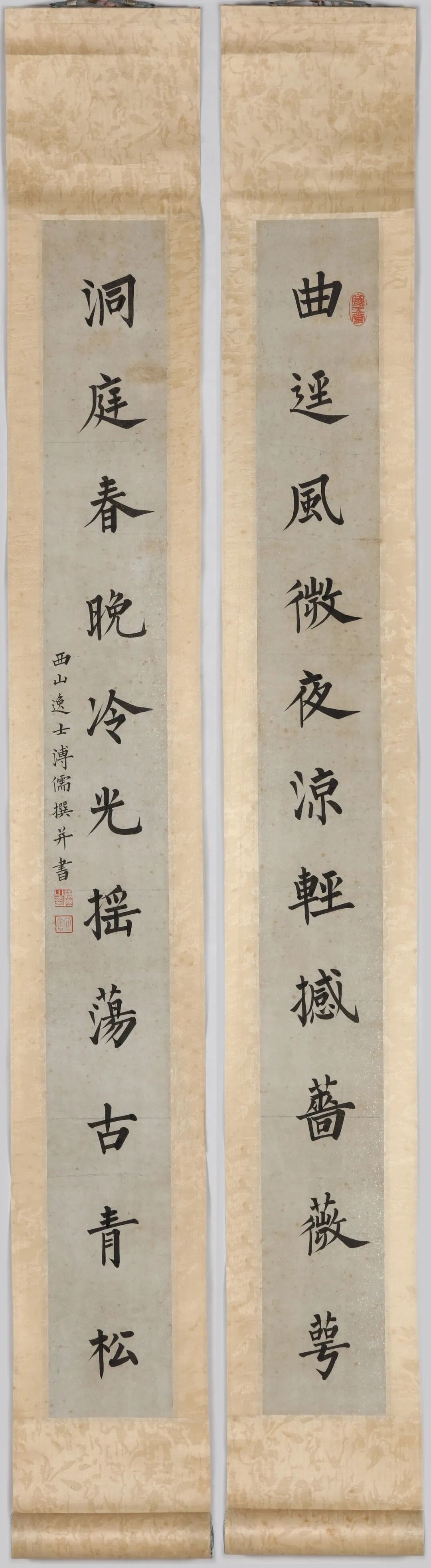 题识:曲径风微夜凉轻撼蔷薇萼,洞庭春晚冷光摇荡古青松。西山逸士溥儒撰并书。