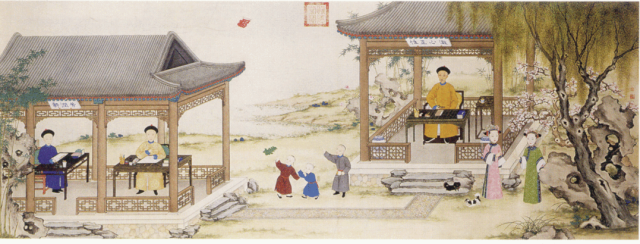 《道光帝行乐图》,清宫廷画家绘。道光帝端坐于书案前,皇四子奕詝、皇六子奕訢兄弟在芳润轩中读书、习文, 皇七子奕譞、皇八子奕詥、皇九子奕譓正在放风筝,皇五子奕誴已过继,