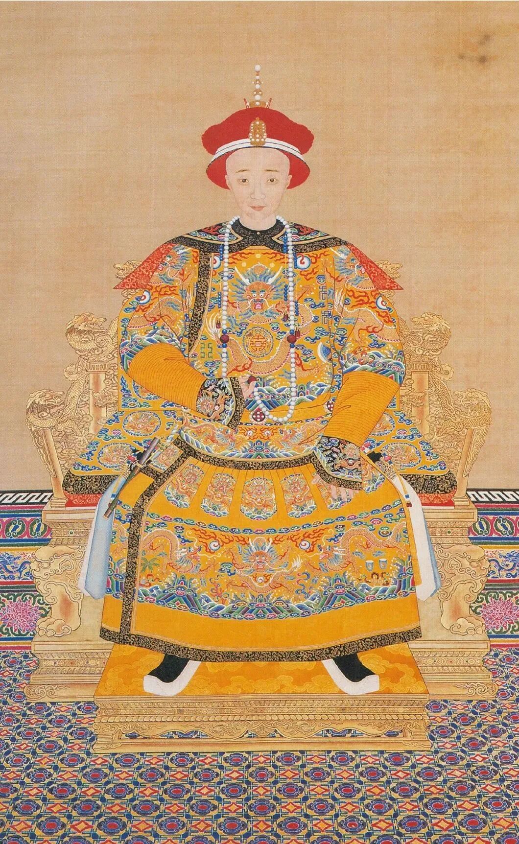 道光帝旻宁(1782 —1850)朝服像皇长子奕纬死的时候,后宫中受宠的全贵妃钮祜禄氏正身怀六甲。她恐怕比道光帝更希望自己能生个儿子。谁不知道,姿色再美也会随年龄而消退,以此受宠必不能长久。在宫中,母以子贵!若有一个好儿子,情况就不一样了,不仅将来能有个依靠,而且若儿子能讨父皇喜欢,自己不是可长以专宠吗?钮祜禄氏,二等侍卫颐龄之女,生于1808 年3 月24 日,与皇长子奕纬同岁,小道光帝26 岁。她入宫的准确时间今已不可考,史籍上称道光初年入宫(道光元年为1821 年)。这与满旗官员家女子13 岁至15 岁选秀女的规定相吻合。而她在幼年时,曾随父亲宦居苏州,颇受江南秀丽之气,看来很是讨道光帝的喜欢。一入宫便赐号全嫔,在后宫的“皇后、皇贵妃、贵妃、妃、嫔、贵人、常在、答应”八个等级中居第五等,为最低一级的“主位”(清代制度,嫔以上为“主位”,与贵人以下有明确区别)。但在 1823年,便册晋为全妃,1825年再晋为全贵妃。这种地位的迅速上升反映出来的当然是道光帝的宠爱,而道光帝赐号中的“全”字,更见匠心。大约她是色艺明慧一应俱全吧。私家记载亦称,她曾仿照民间的七巧板,斫木片若干块,排成“六合同春”四字,作为宫中的新年玩具。钮祜禄氏入宫后,曾于 1825年生下皇三女,1826年又生下皇四女。可在那个时代,女儿不值钱。皇三女死于 1835年,仅十岁,追赠端顺固伦公主。皇四女于1840 年下嫁蒙古王公,封寿安固伦公主,1860 年去世。两位公主在当时和后来都没有什么影响。已经生下两位皇女、正在圆明园湛静斋待产的全贵妃,多么盼望上天此次能赐予她一位皇子。是男是女,绝对不一样,更何况正值前三位皇子俱亡的特别时刻。因此,她在千辛万苦终于产下一个男婴时,