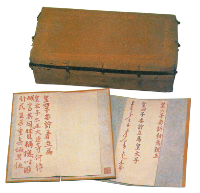 道光帝立储朱谕、匣及临终朱谕而在中国第一历史档案馆保存的立储匣,似更能说明问题。它是以楠木制成,十分精美,除安放合叶的一面外,能开启的三边均贴有封条,两端的封条上有道光帝的亲笔签名,而正面的封条上除了道光帝的签名外,另有道光帝亲书:道光二十六年立秋(以下字迹残缺)