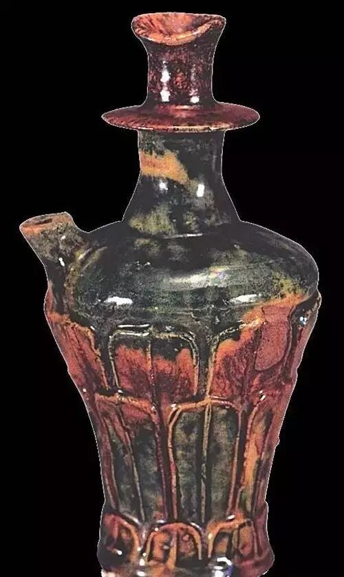 低温铅釉器。圆唇,口微侈,一侧按压成流状;长颈上细下粗,颈中部饰相轮状圆盘;斜折肩,一侧塑短直流;上腹鼓,向下斜收,胫部内曲,平底。腹刻三重仰莲纹,莲瓣肥硕、圆润。胎色黄灰,质地较粗。通体施黄、绿、酱三色釉,彩釉交错使用,并不规整,施满釉。为河北定窑北宋初期产品。