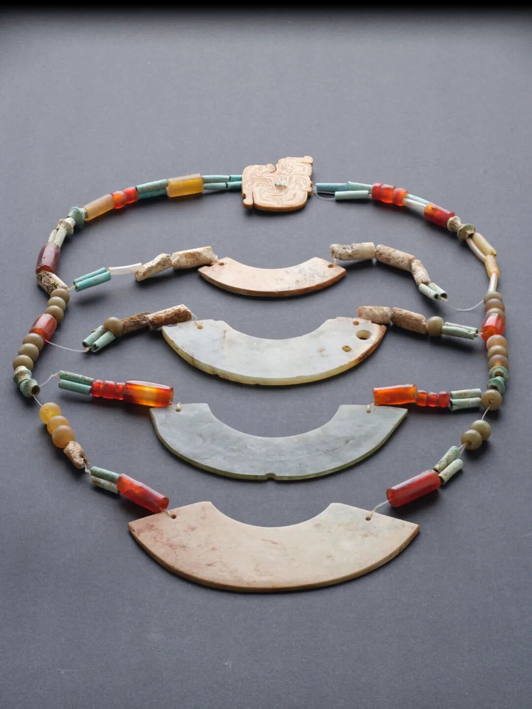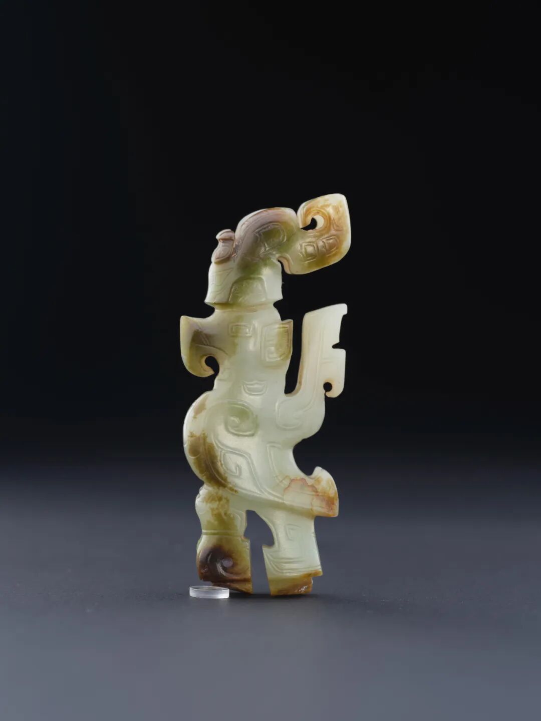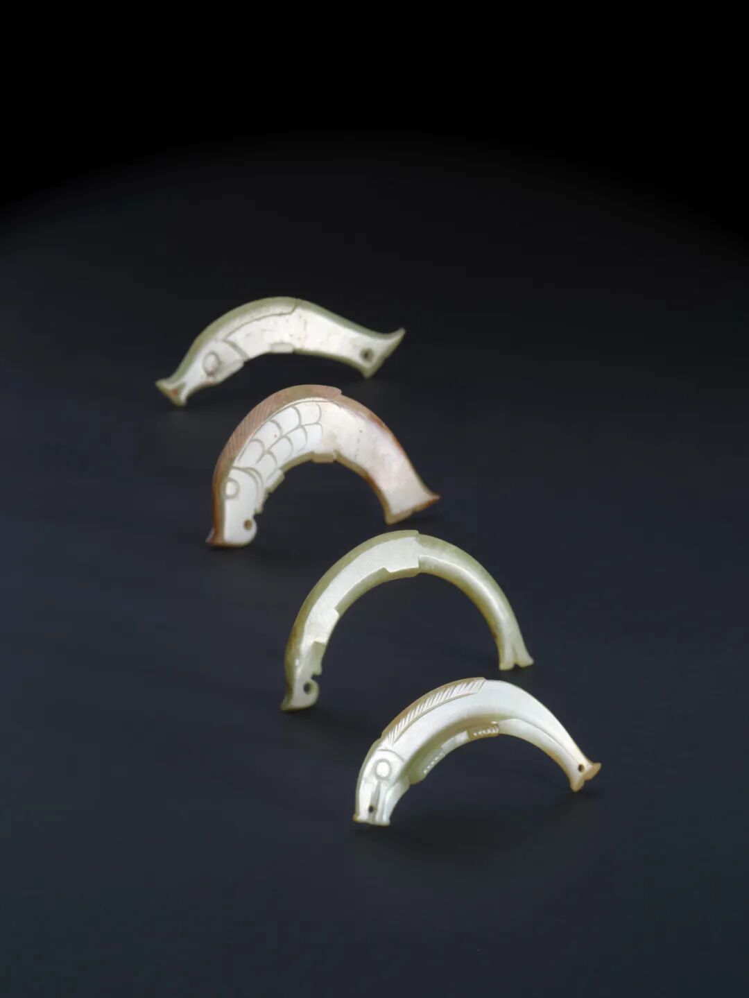 进入序厅,玉器阵列满面铺陈,西周文化的浓郁丰富不言而喻。初探古玉之隽美。红青碧绿黑白,繁杂参差的玉料折射出一派溢彩流光的亮丽景象。鱼牛鹿兔龟蝉,因料施工的技艺雕琢出一众千形万象的独特造型。龙纹凤纹人纹,内细外粗的双线谱写出一片婉转流畅的飞扬文章。![]()