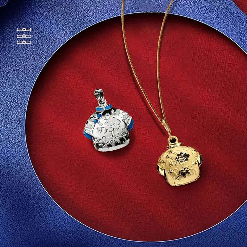 小棉袄除了在花纹上尽显富贵吉祥以外,领口、袖口处采用低温珐琅工艺。红色、粉色、蓝色、绿色,五种喜庆的色彩与银色交织碰撞,喜庆十足。