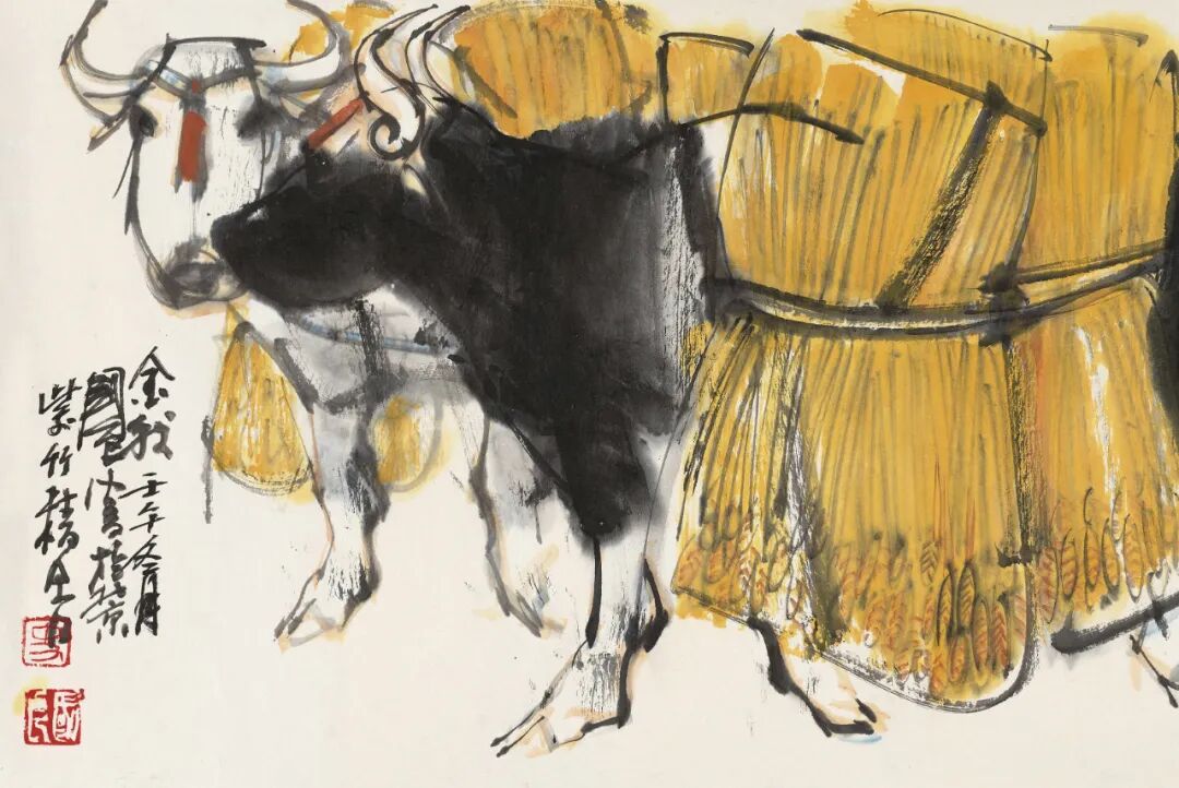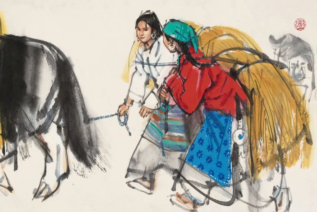 色调是画面的氛围,逸笔人物画用色必须把握好画面色调的浓淡、冷暖的对比与和谐。所以在一幅画的色彩构成时,必须把墨色、肌理、色块、空白都估计在内。在以墨为主的基础上,还要有色调的提炼。一般有冷色调、暖色调、灰色调、红色调、蓝色调的区分,用以表达不同的情感和主题的需要。如史国良的《金秋》,描绘的是几位藏女正在挥镰收割的劳动场面,为了表现“麦菽千层浪”的丰收景象和增加画面的喜庆气氛,画家以金黄色作为画面的主色调,就十分恰当得体,既庄严典雅,又有透明感,故值得我们借鉴。
