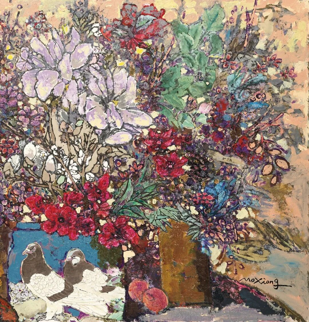 他的作品大多以花为题材,但不是一般的静物,也不是风景,他说过:“花,可能是作为一个象征,可能是我个人的写照,可能是我看世界的感受,能是世界的幻景,可能是宇宙不可言说的真理。”莫雄的作品没有任何描述性的内容,花在他笔下也逐渐演变为一个抽象的画面,但我们分明从中感受到了一种心态,一种情绪,一种对世界的看法,以及一种对人生的体验。