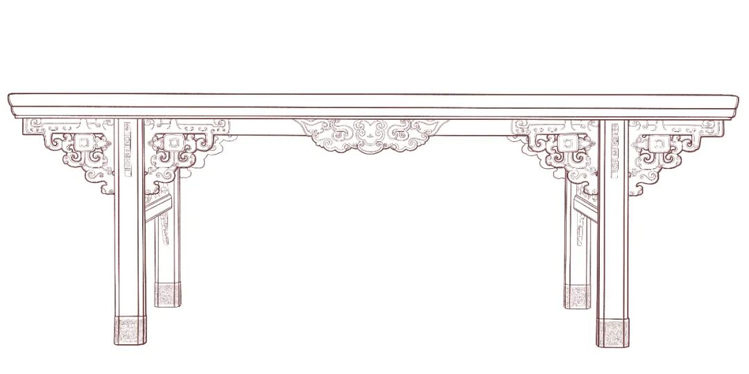 此件画案在装饰纹样上显现仿古之风,即两点特征,一、左右角牙透雕,上段卷珠拐子纹为螭尾纹的变异体;二、腿面上端出戟,结合方式仍以明式家具的核心——榫卯结构完成,但视觉上有如三代青铜器出戟般的高古之感,在清代代表了一种独树一帜的时风——仿古与鉴古。![]()