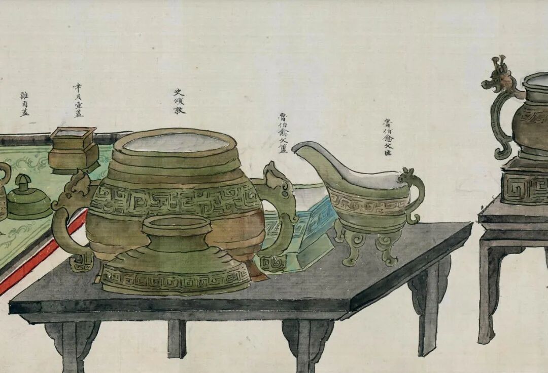 第二,“鉴古”则是从此张画案的功能上对于当时宫廷庆典以及文仕生活的一种真实的见证。清代曾多次举办祝贺皇帝和太后逢旬寿辰的万寿庆典,其中康熙、乾隆二朝更先后合共举办了四次千叟宴。逢重要的庆祝活动,皇子皇孙会于帝后寿辰敬呈寿礼,王公大臣也纷纷进献寿礼,争奇斗巧,各类古玩书画齐聚一堂,此时,用于众人齐聚雅集赏画鉴古的巨大画案就成为此类祭祀与文仕生活中必不可少的家具陈设,而此件画案,从此巨大的尺寸与仿古之纹样上来看,正属于此类庆典与雅集所用的大案。同类使用场景可参考明代杜堇《玩古图》、仇英《人物故事图册·竹院品古》、清代郎世宁《乾隆帝观画赏古图》等。美国芝加哥艺术学院2018年所办展览《吉金鉴古:皇室与文人的青铜器收藏》中亦在展示数件有同样装饰风格的青铜礼器的同时,再次以长手卷《愙斋集古图》展示了一个真实的清代人尚古与鉴古的场景,无论是其上所绘场景中的大案还是此手卷的尺寸皆为我们再次揭示了一个真实的清代祭祀与文仕生活中最为时尚的活动“鉴古”,而正是这种新的时风为这个时代创造了一些新颖且珍罕的家具样式,例如此张紫檀大画案。![]()