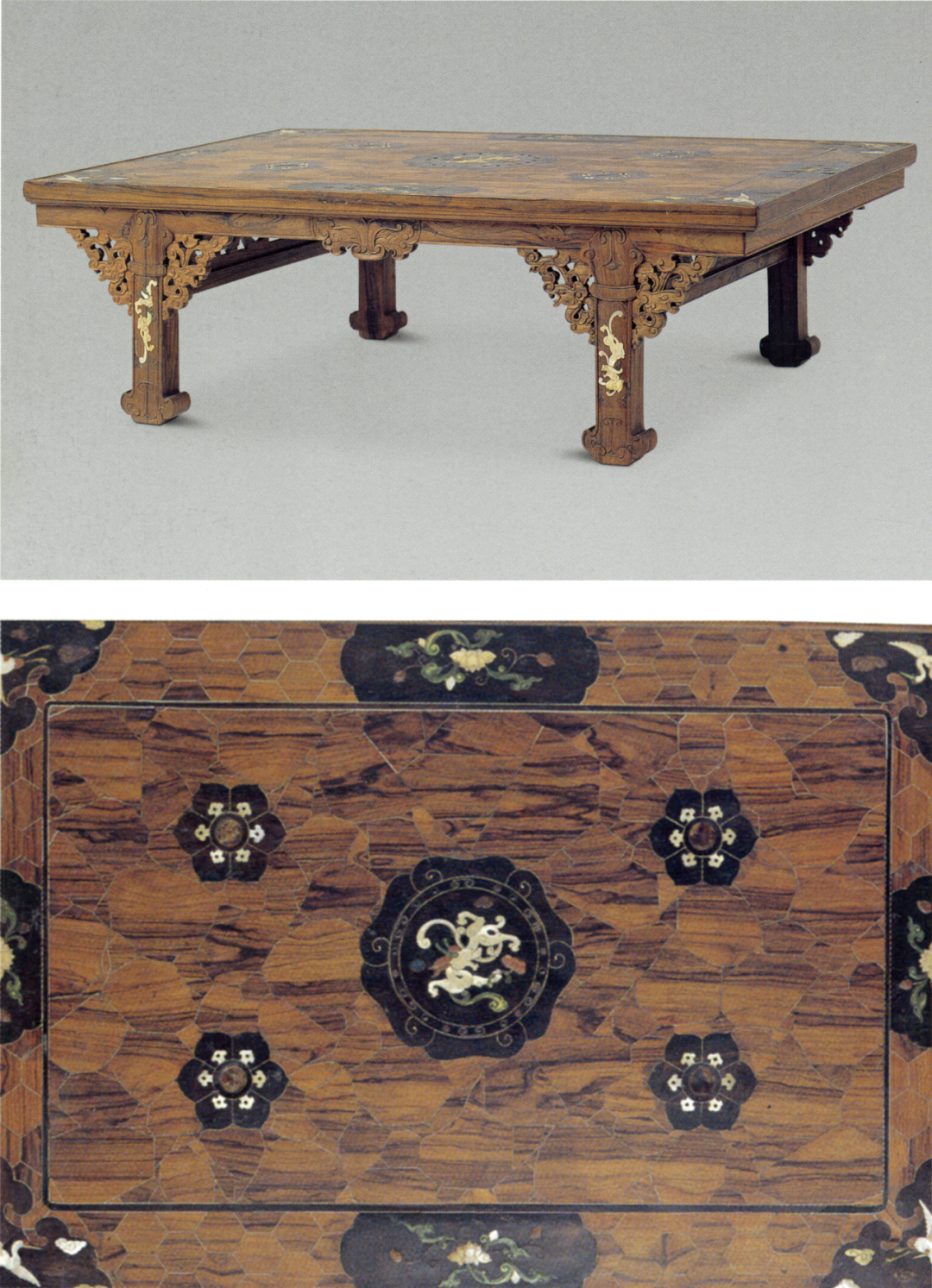 包镶是清早期、清中期的一种制造流派,工艺上独树一帜。它堂堂正正,没有廉价、权宜的影子。清朝廷《造办处各作成作活计清档》载,“雍正五年六月二十四日,圆明园来帖内称,郎中海望奉旨:‘着做长五尺四寸、宽三尺三寸、高一尺四寸八分,紫檀木包镶床一张’。”雍正十年十一月十五日传旨“再漆桌面边上回纹锦不用,着用紫檀木包镶。钦此。”(朱家溍:《雍正年的家具制造考》)故宫宁寿宫花园(俗称“乾隆花园”)的倦勤斋是级别最高、最豪华的宫殿,用于乾隆帝养老。其内檐装修罩槅大框都是以紫檀包镶楠木。故宫中的许多挂屏都是紫檀包镶。家具珍品实例,如紫檀海水江崖龙纹大宝座,也是紫檀包镶做法、楠木胎。牙板上图案也是变体正面螭龙纹。![]()