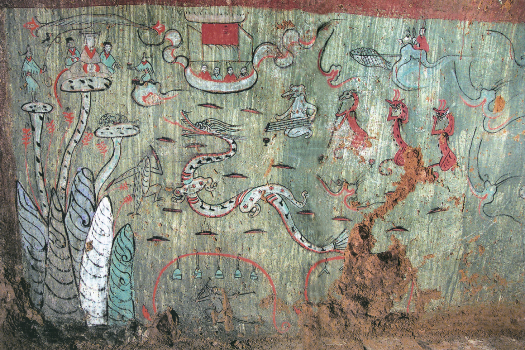 西王母端坐于昆仑山上,众多仙人前来赴宴,龙、蟾蜍等神兽以舞乐助兴,与铜镜中的神兽舞乐类同。