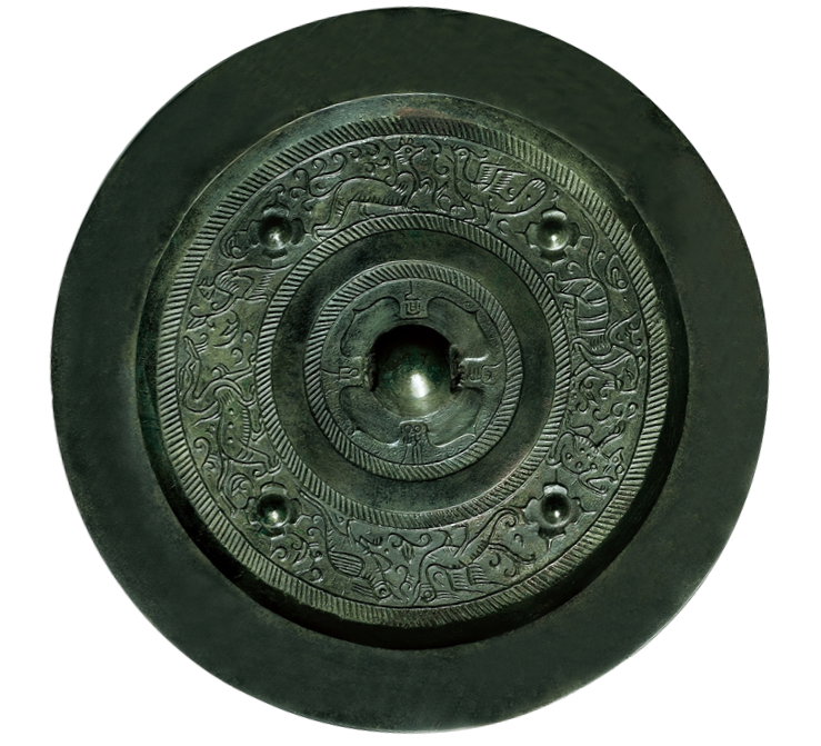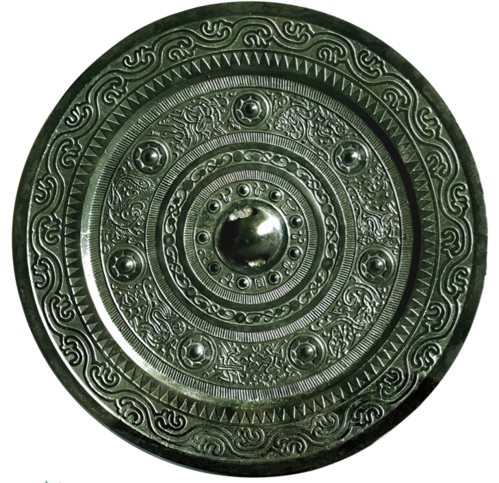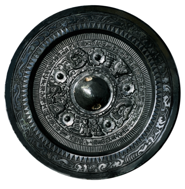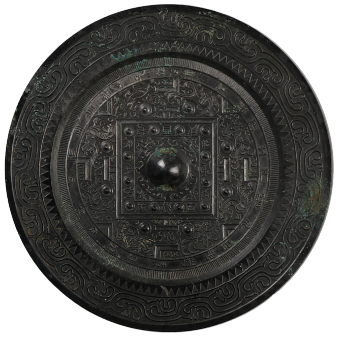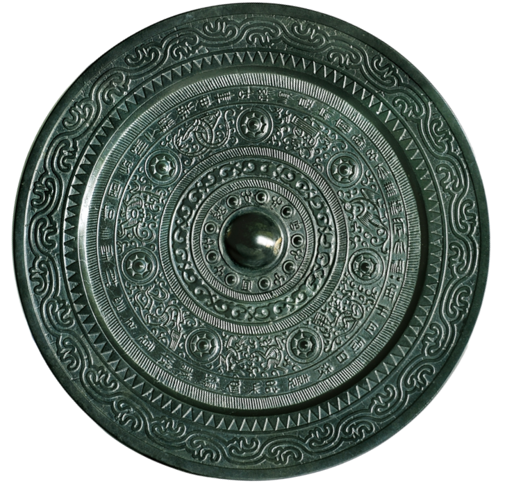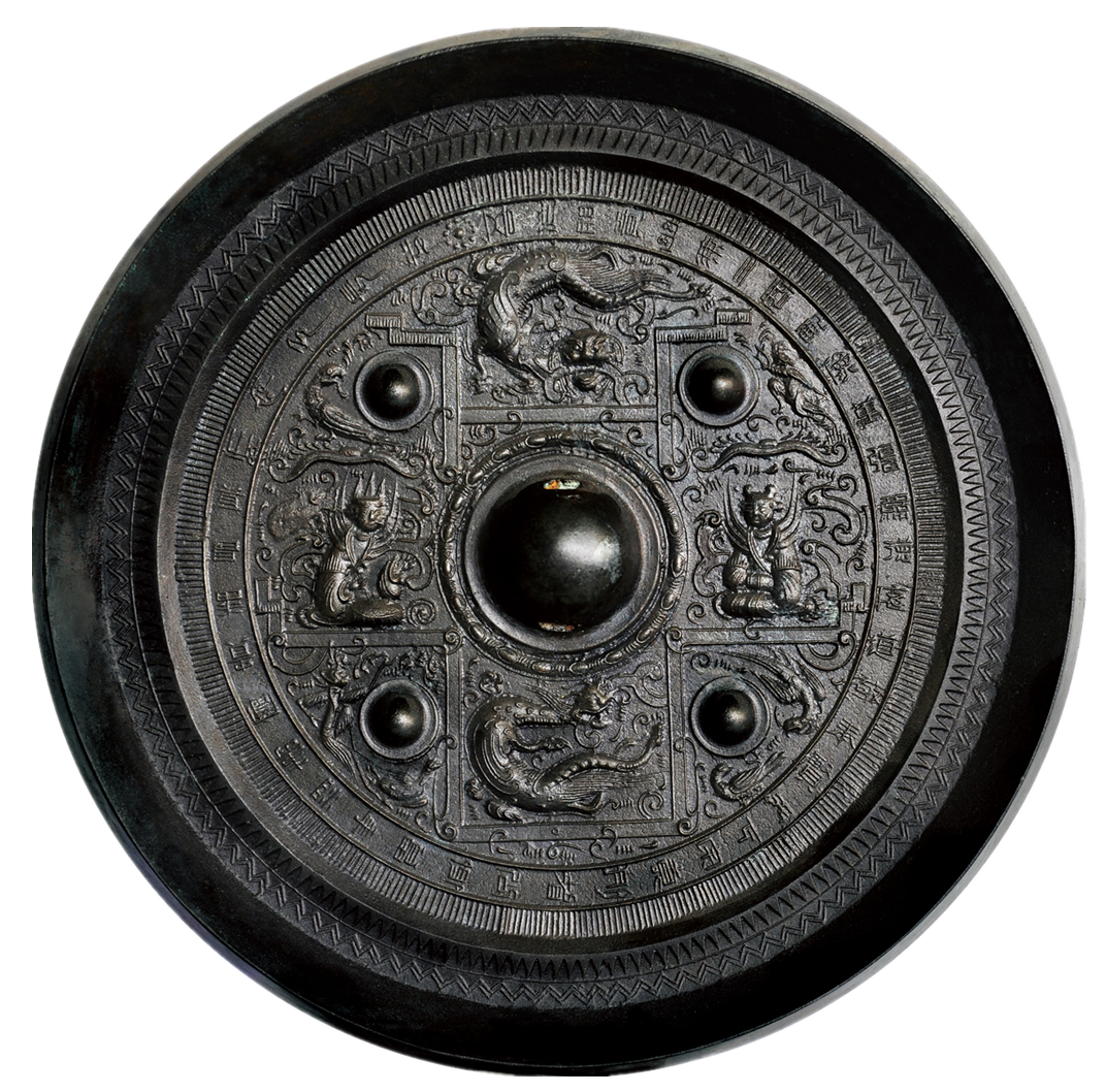 铭文:角王巨虚日得憙, 昭(照)此明镜诚快意,上有龙虎亖(四)时置,长保二亲乐毋事,子孙顺息家富盛,予天无极受大福。