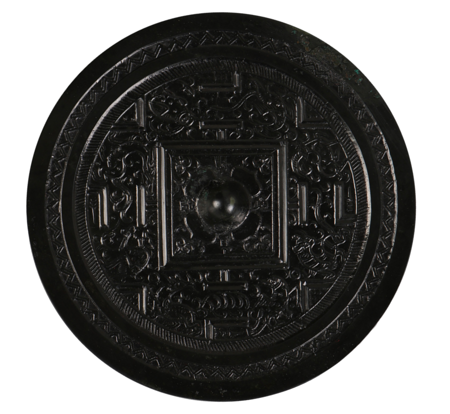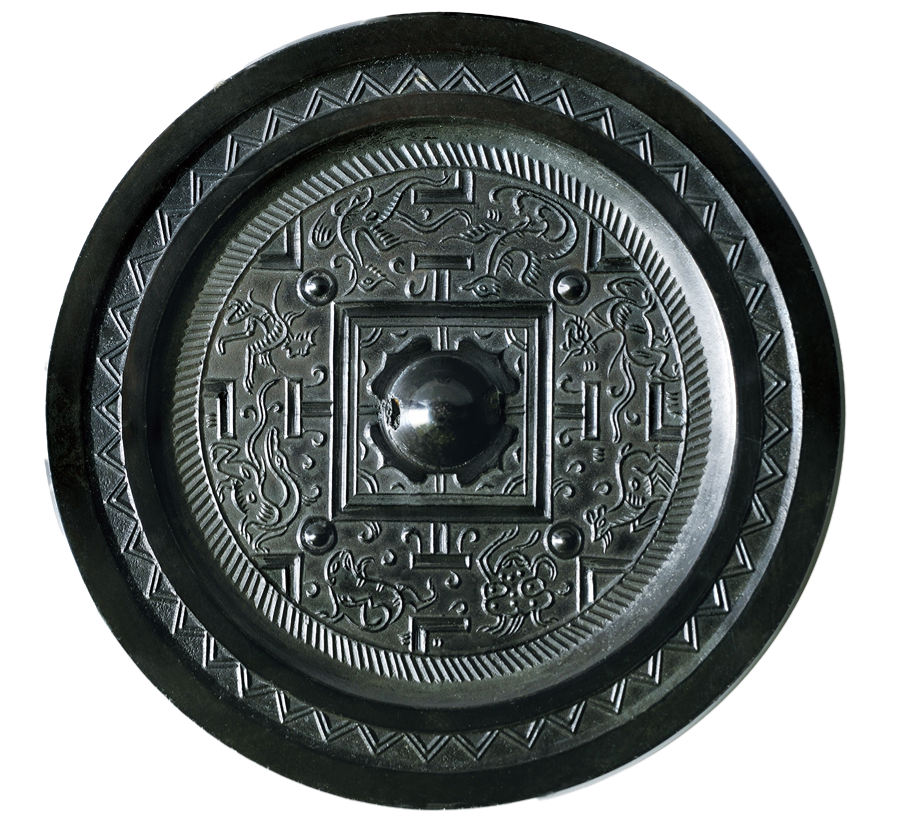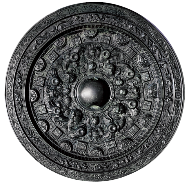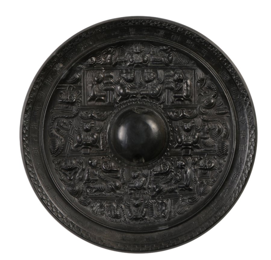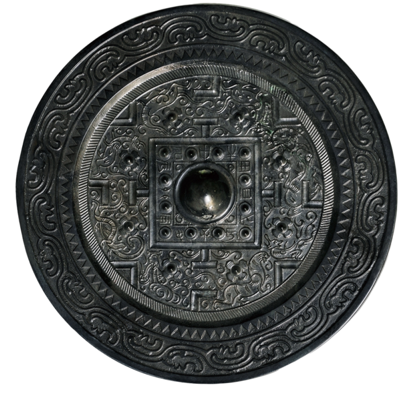 铭文:角王巨虚日得憙, 昭(照)此明镜诚快意,上有龙虎亖(四)时置,长保二亲乐毋事,子孙顺息家富盛,予天无极受大福。