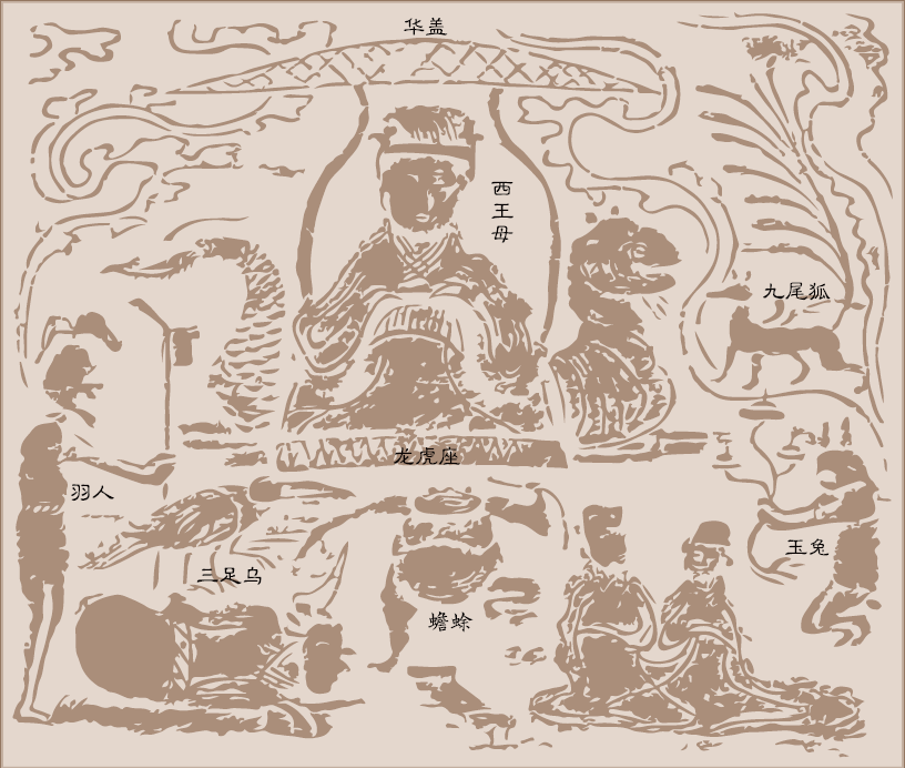 《山海经》中的西王母,“其状如人,豹尾虎齿,善啸,蓬发戴胜”,俨然凶神的形象;而西汉司马相如《大人赋》中的西王母,则变成一位“暠然白首”的仙人。西汉《淮南子·览冥训》云:“羿请不死之药于西王母”,更是将西王母当成掌管不死之药的仙人。