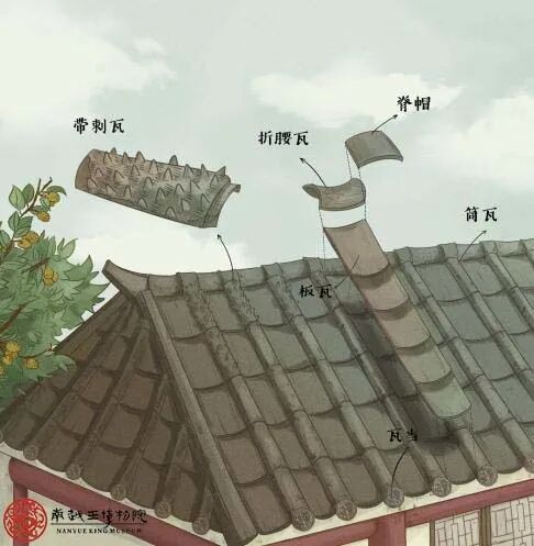 屋顶外沿的部分又有不同的构件。与最外沿的筒瓦相连接的称为瓦当,一般有圆形和半圆形两种。汉代以前半圆形瓦当较为常见,汉代以后圆形瓦当就成了主流。至于板瓦的最外沿,后代的建筑中多连接有三角形的滴水,可以引流雨水,防止雨水往后流到墙体。南越王宫出土大量印有“万岁”字样的圆形瓦当,却未见滴水。