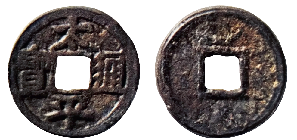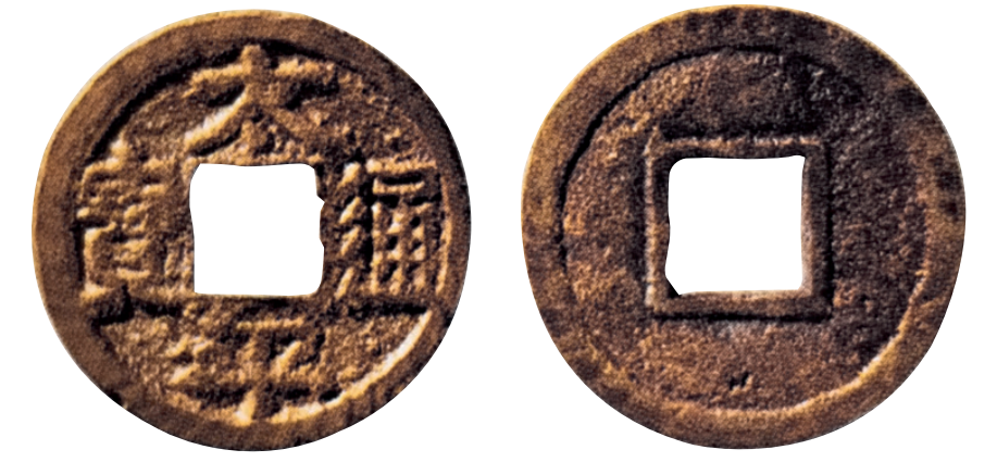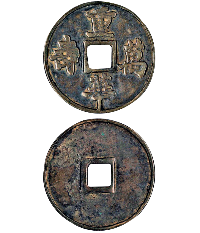 无独有偶,近年藏界又发现有另一版式淳化佛像金钱,折十大小,重近40克。正面“淳化元宝”四字楷中带隶,背三尊佛像,除穿左右外,穿上亦置一尊。穿下一香炉状物。但此版与五台山发现的双佛版比较,文字及佛像的力度均不及后者。